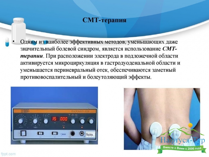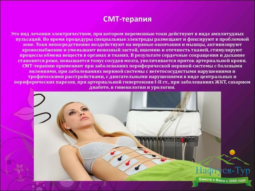 СМТ-терапия (амплипульстерапия) – вид электротерапии, лечение синусоидальными модулированными токами. Медицинская аппаратура, применяемая в санаториях для проведения этих процедур, генерирует электрические токи частотой от 2-10 кГц, позволяя устанавливать их амплитуду и серийность импульсов. Считается, что токи данного диапазона частот соответствуют биоритмам человеческого организма, а это обеспечивает более глубокий терапевтический эффект по сравнению с вариантом использования для лечения постоянного непрерывного электрического тока. Добавим, что разновидностью данной методики является СМТ-форез, при котором с помощью той же аппаратуры осуществляется введение в организм пациента лекарственных веществ.Сеансы СМТ-терапии обеспечивают нейростимулирующее, обезболивающее, сосудорасширяющее и трофическое действие. Наиболее часто данный физиотерапевтический метод используют при лечении заболеваний периферической нервной системы, опорно-двигательного аппарата, ЛОР-органов, язвенной болезни желудка и двенадцатиперстной кишки, пиелонефрите, сердечнососудистых заболеваниях.