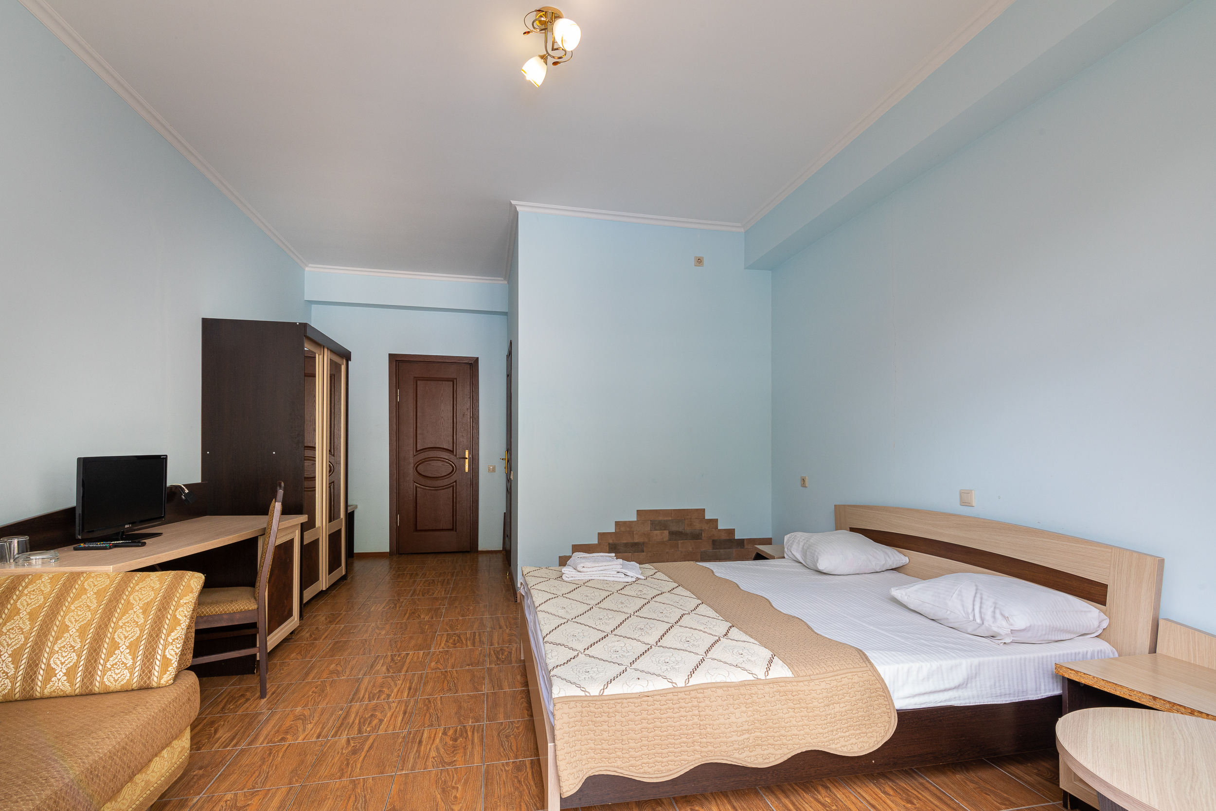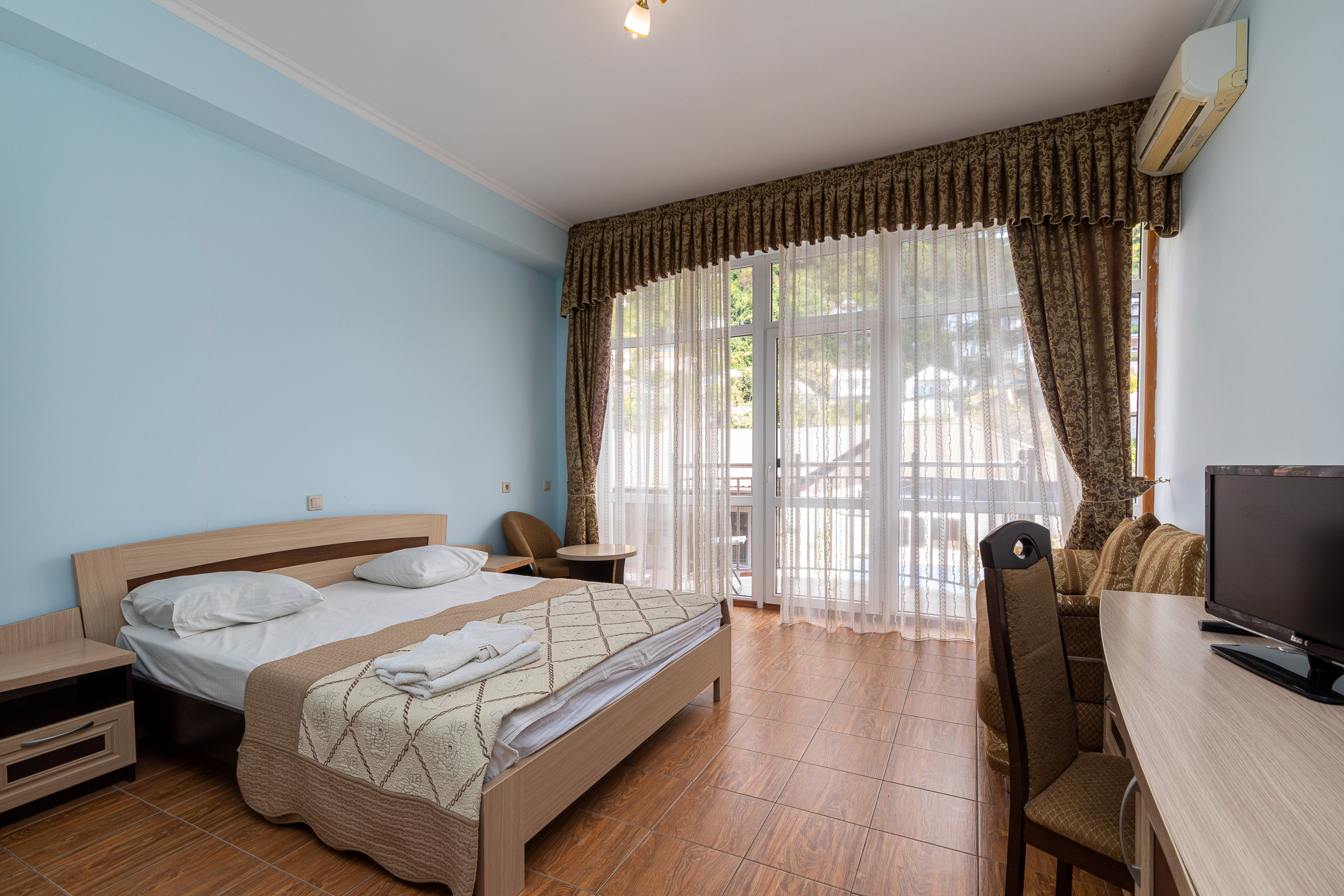 Небольшой, но очень уютный отель. Провели здесь прекрасную неделю. Обстановка тихая и спокойная. В номере чисто, хороший вид из окна, удобная двухместная кровать, телевизор, холодильник, кондиционер и комфортный диванчик.