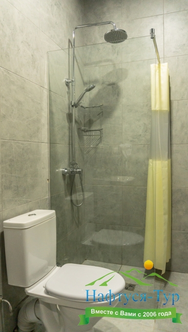с душем или ванной, тапочки, туалетные принадлежности, фен