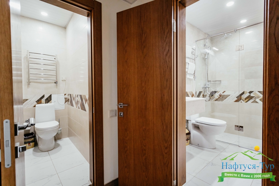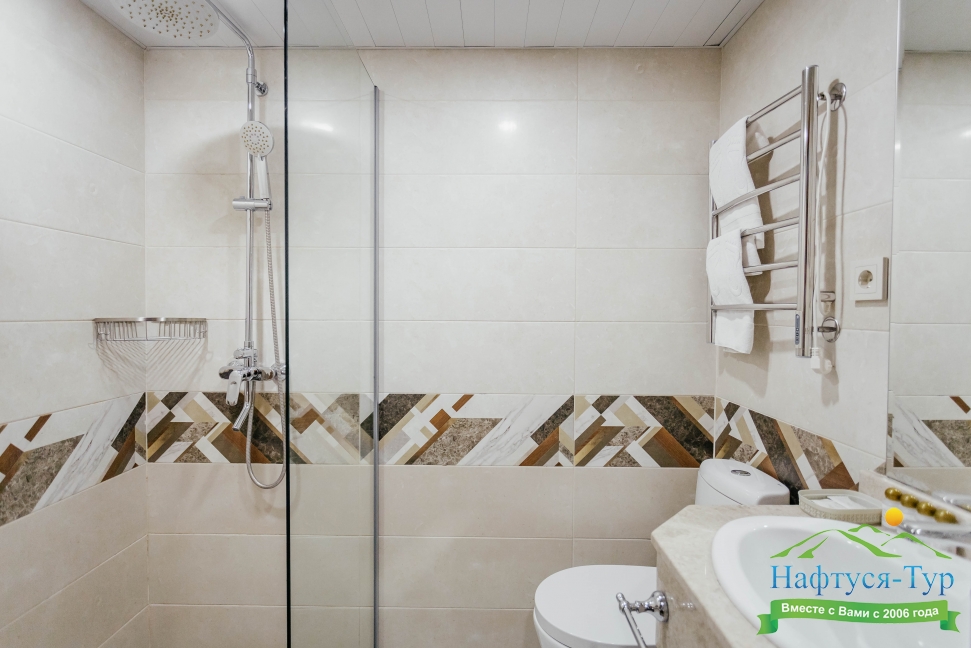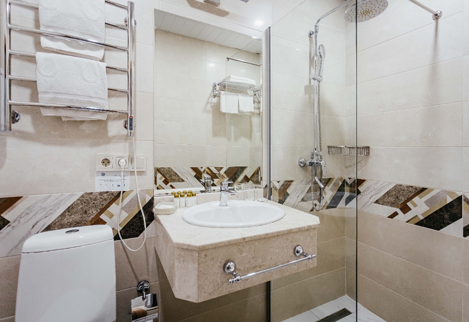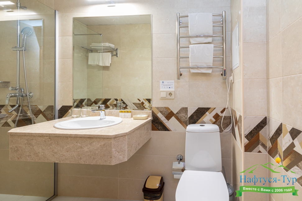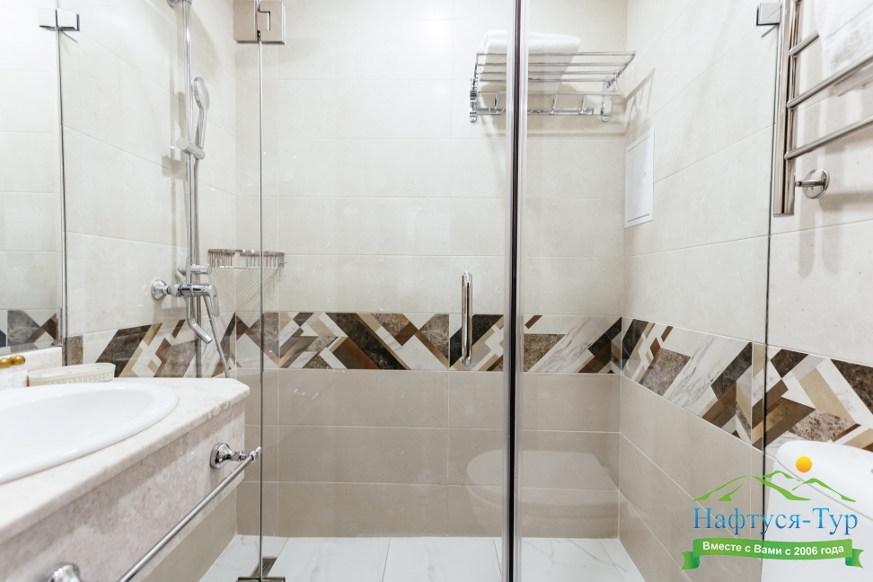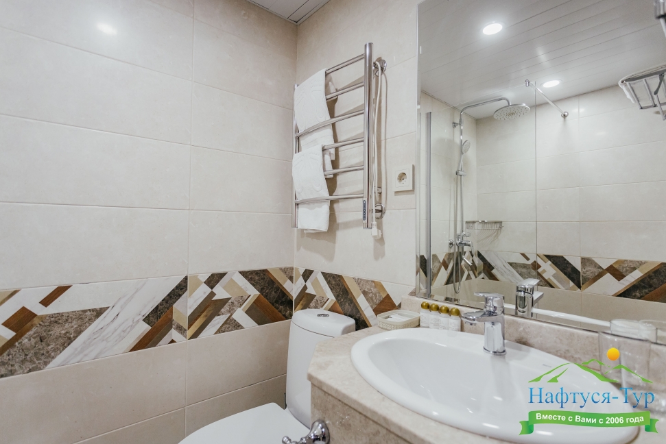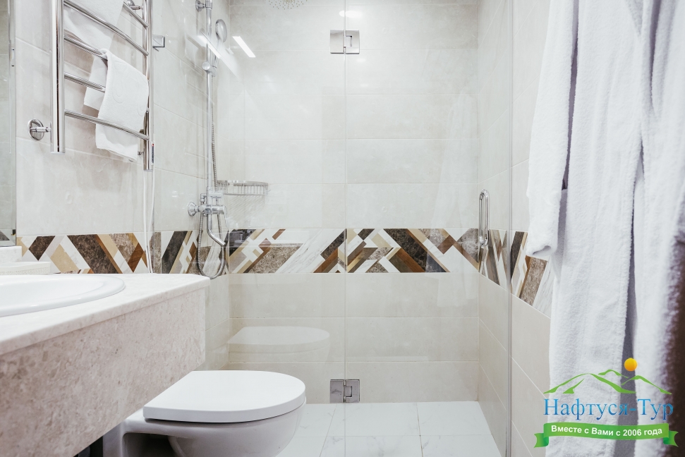 с душем, тапочки, туалетные принадлежности, фен, халат