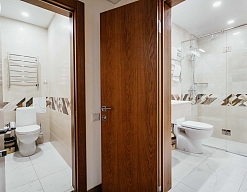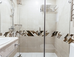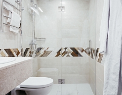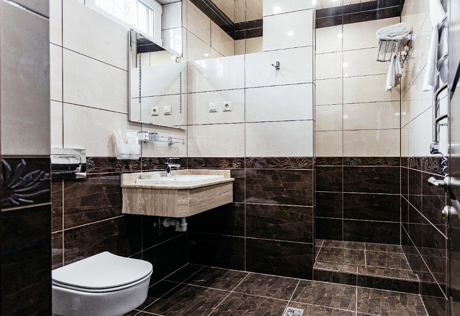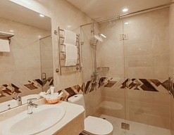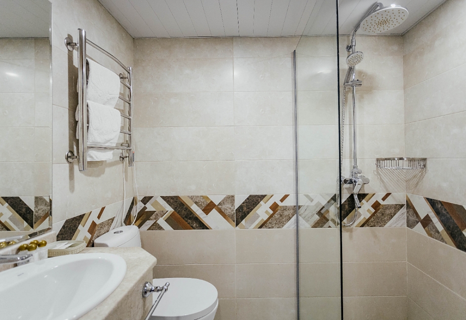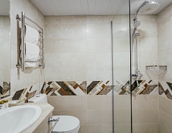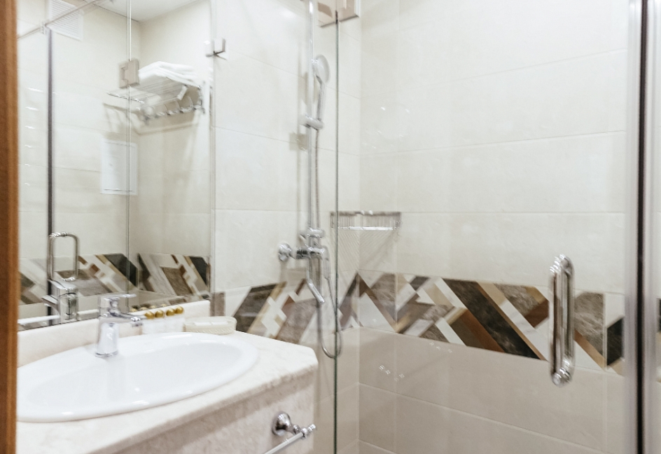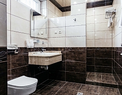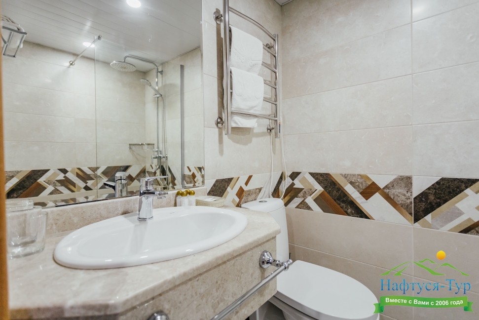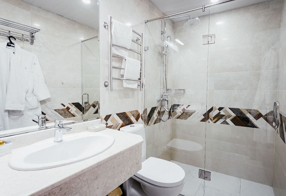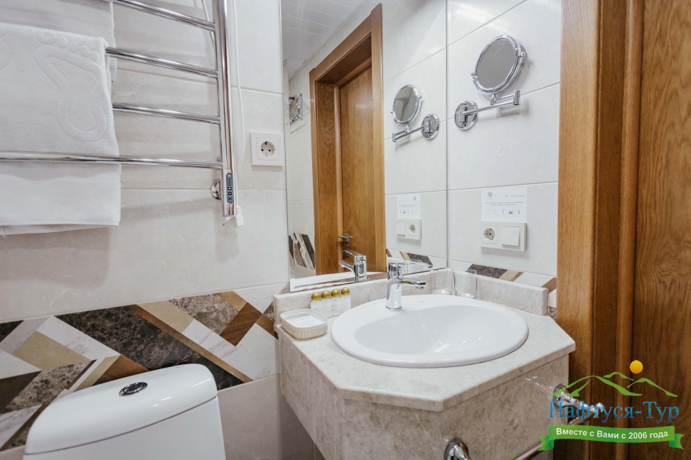 с душем, тапочки, туалетные принадлежности, фен, халат