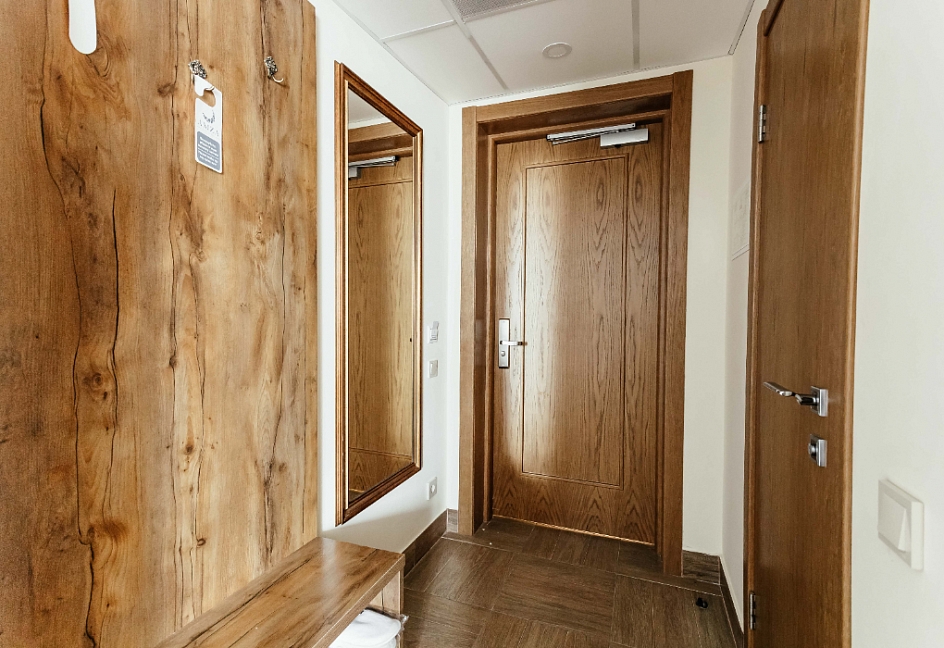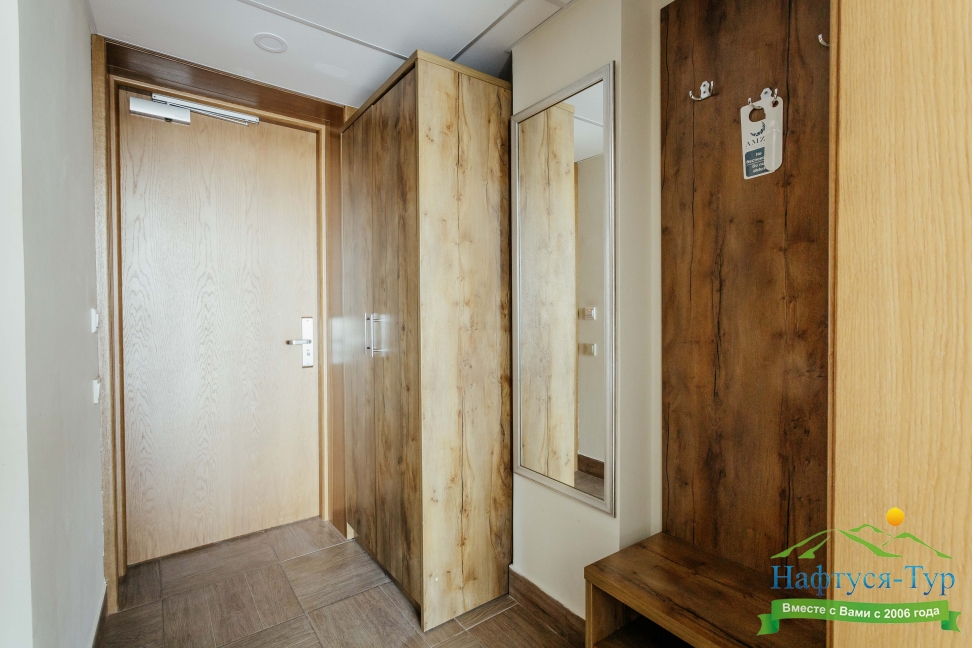 вешалка, зеркало, кровати односпальные /одна двуспальная кровать, прикроватные тумбочки, стол, стулья, шкаф