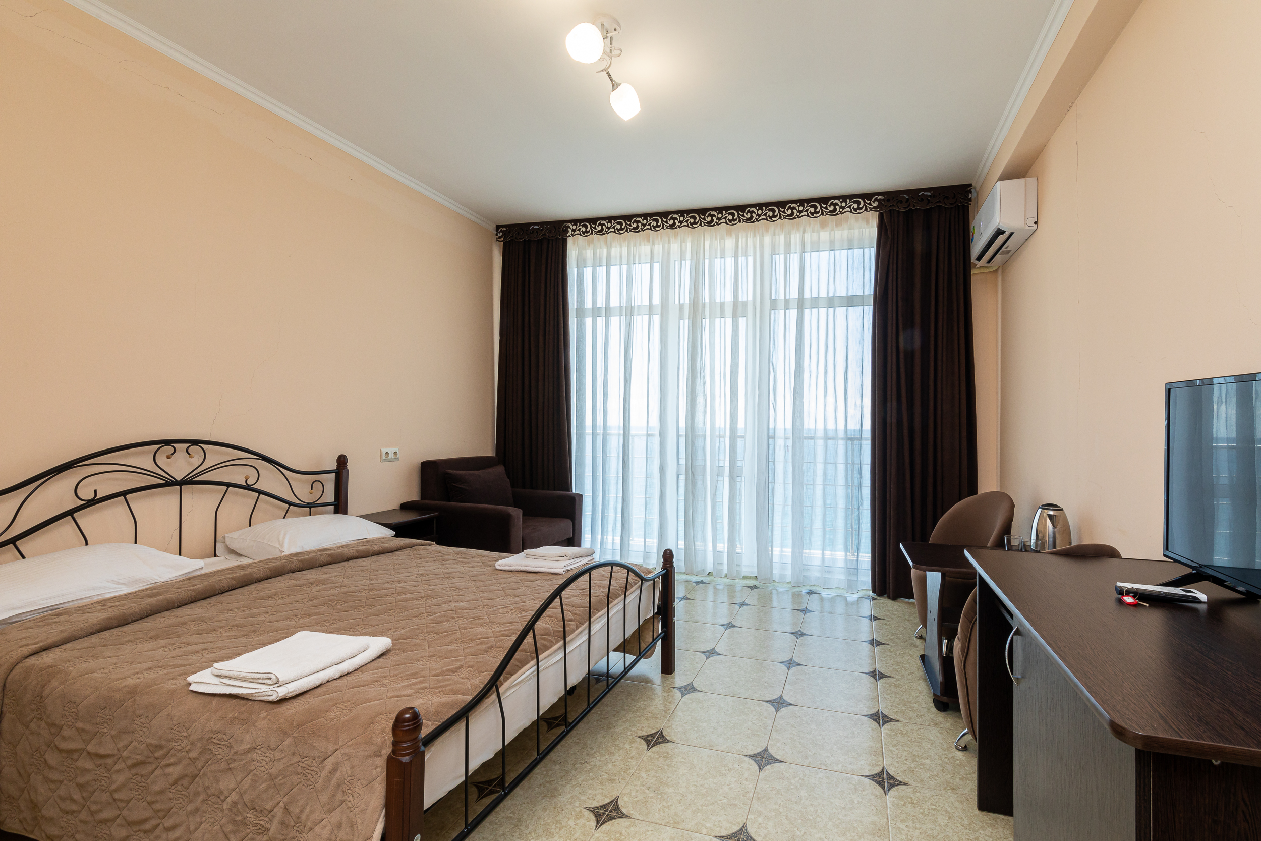 Только что вчера прилетели из Абхазии, жили в Руслане неделю...сначала заселились в номер с видом на горы, потом перешли в номер с видом на море...И тот и другой вид просто супер! Большое панорамное окно вовсю стену, лежишь на кровати и смотришь как плещутся волны.