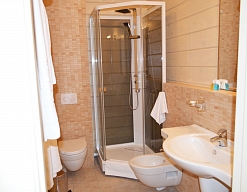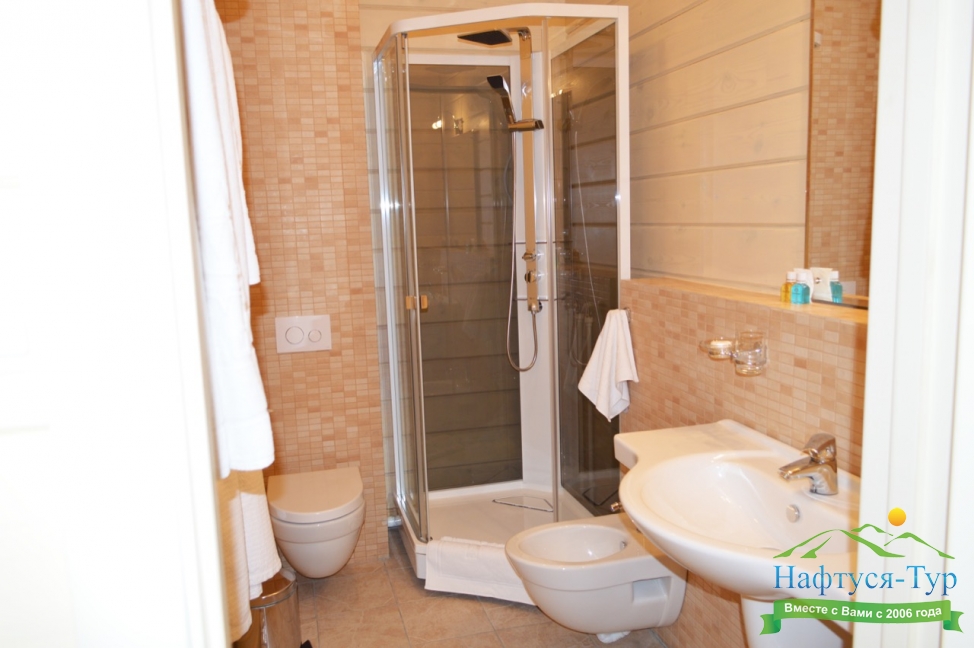 с душевой кабиной, туалетные принадлежности, фен, халат