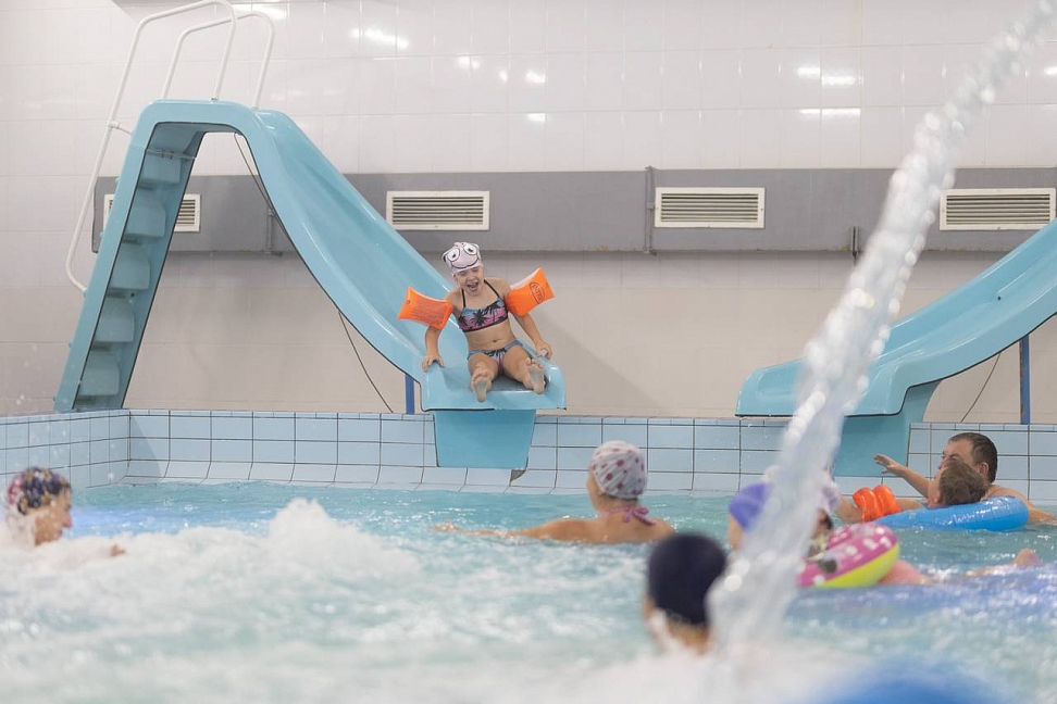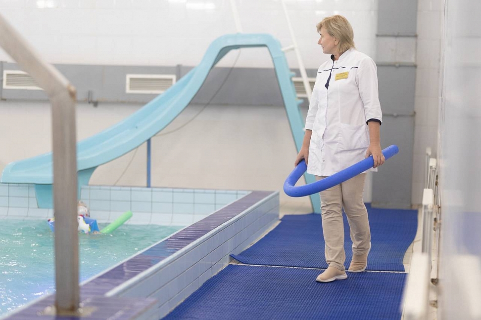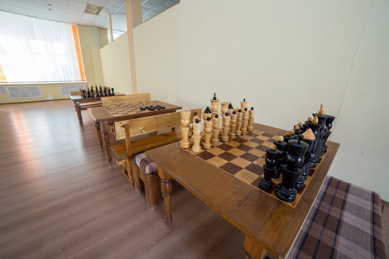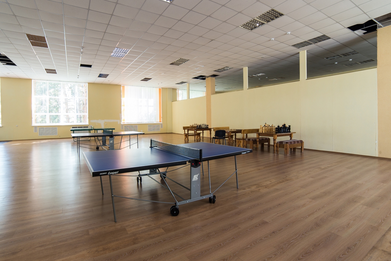 Первым делом в санатории нам показали бассейн, которым стоит гордиться. Бассейн находится на территории санатория в 3-х минутах ходьбы от главного корпуса. Теплого перехода из корпуса в бассейн нет, но размеры бассейна впечатляют. Пятьдесят метров в длину на 7 дорожек - "Олимпийский размер". Также здесь находятся спортивная волейбольная и баскетбольная площадки.