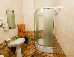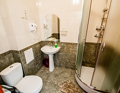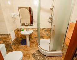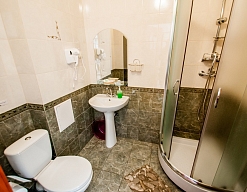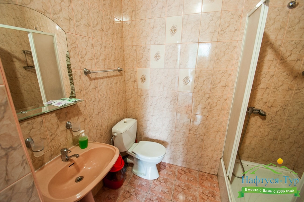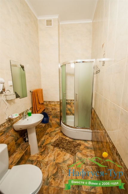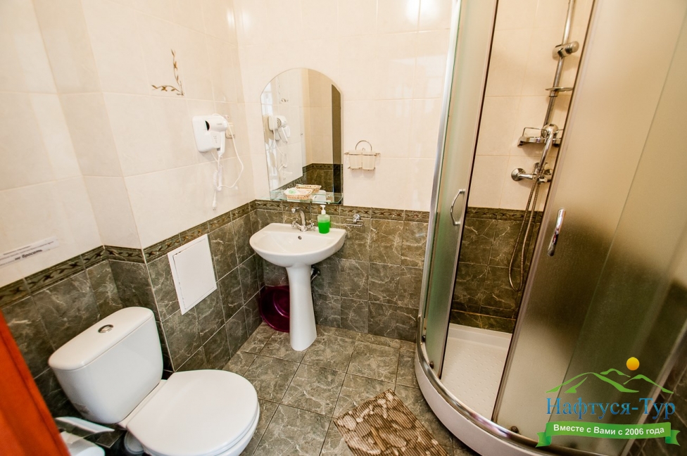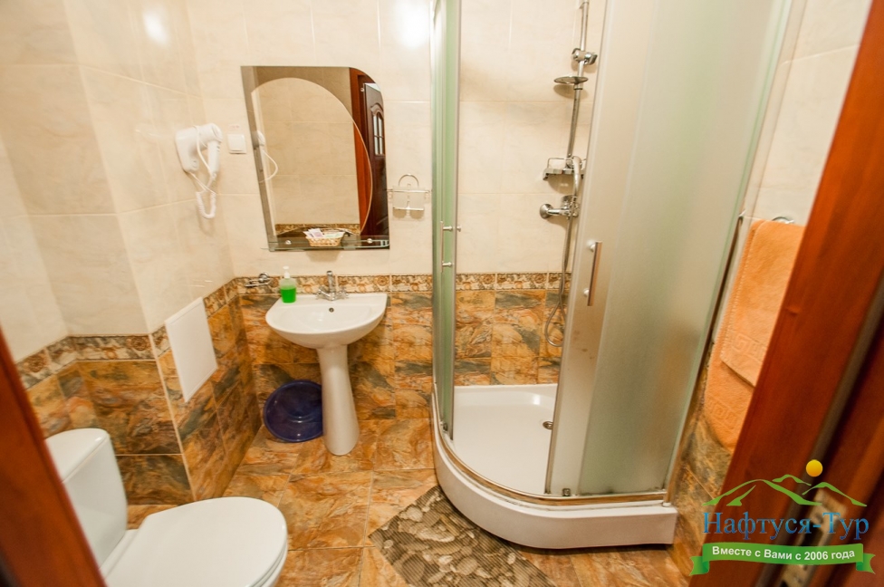 с душевой кабиной, тапочки, туалетные принадлежности, фен