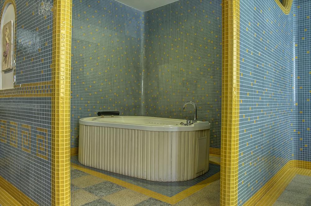 с ванной, тапочки, туалетные принадлежности, фен, халат