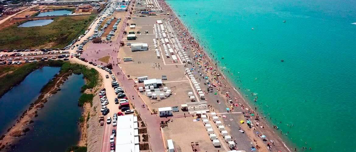 В 500 метрах от отеля, раскинулся один из самых широких песчаных пляжей Крыма. Вход на оборудованный тентами и душем пляж бесплатный.