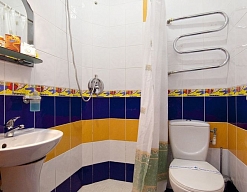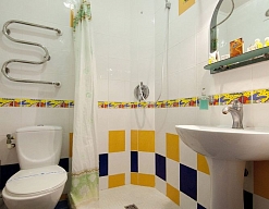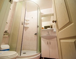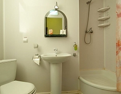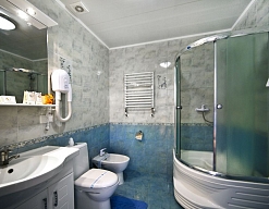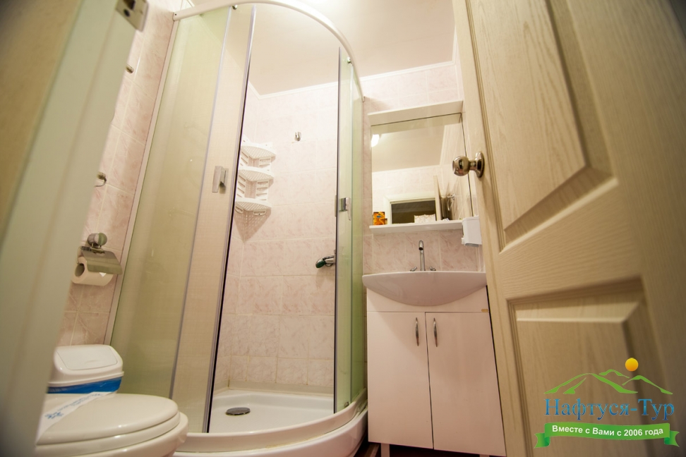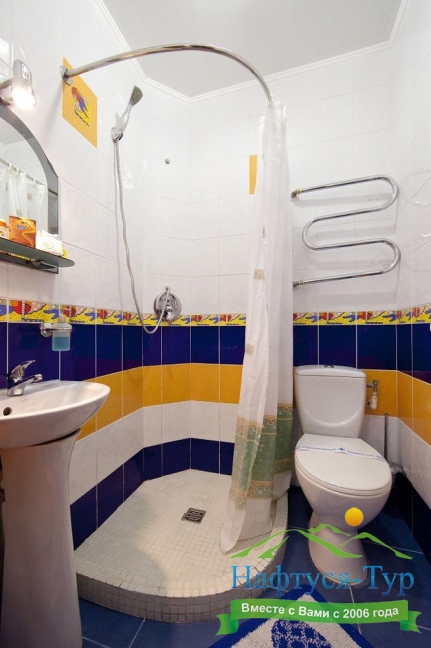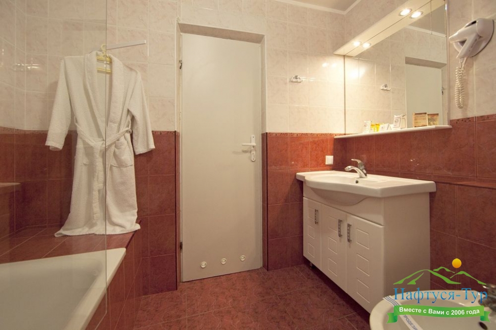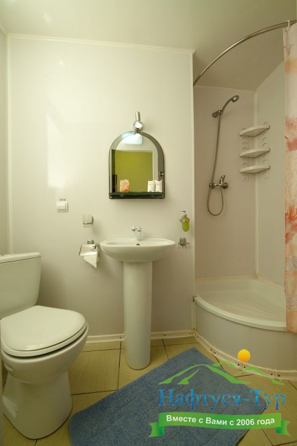 с душем (поддон), тапочки, туалетные принадлежности, фен, халат