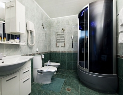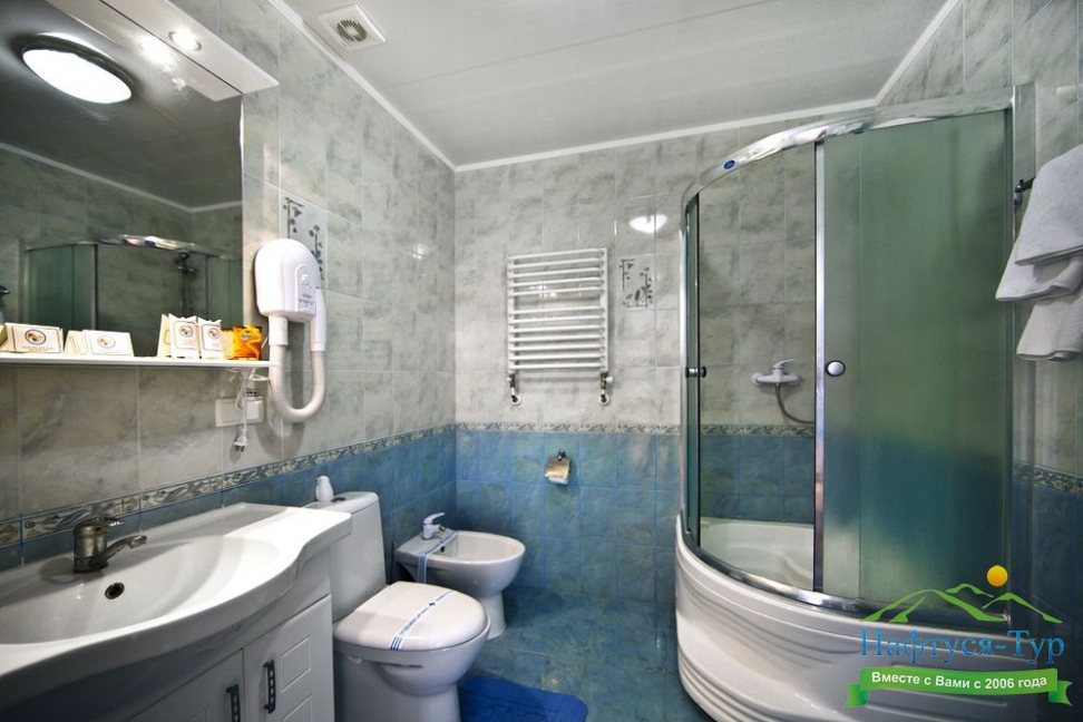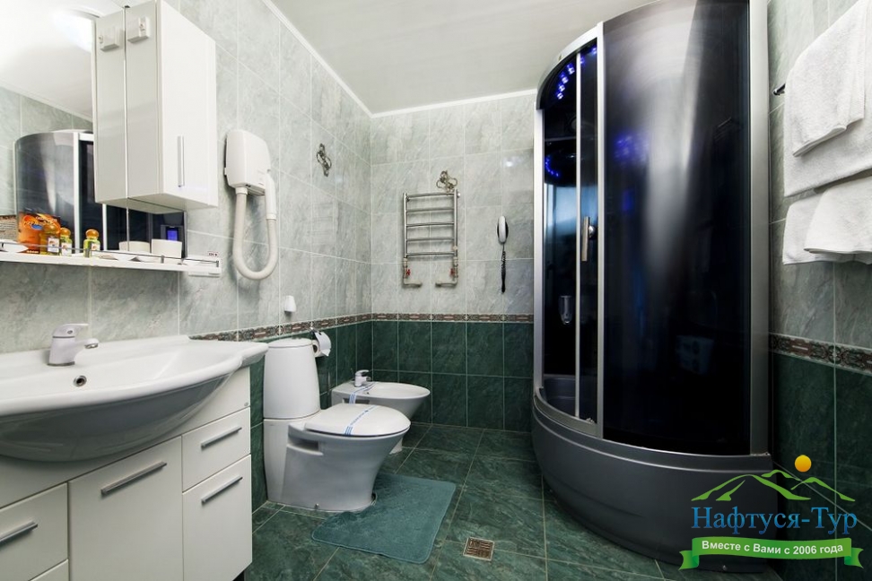 биде, с душевой кабиной, тапочки, туалетные принадлежности, фен, халат