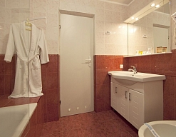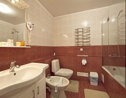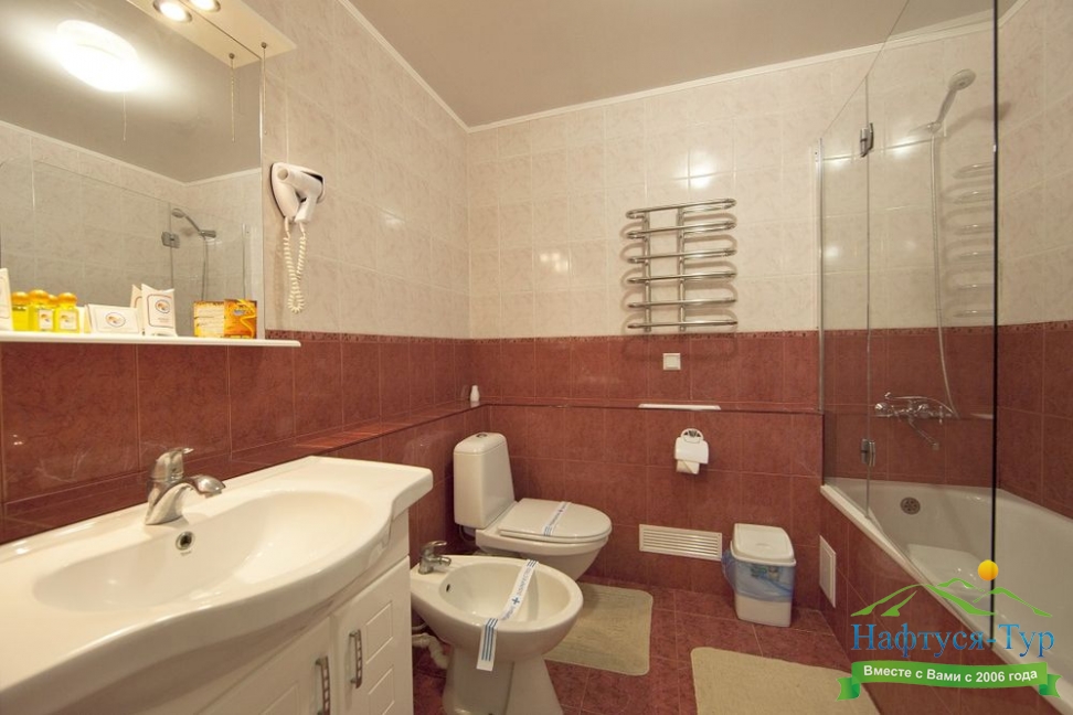 биде, с ванной, тапочки, туалетные принадлежности, фен, халат