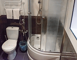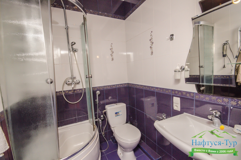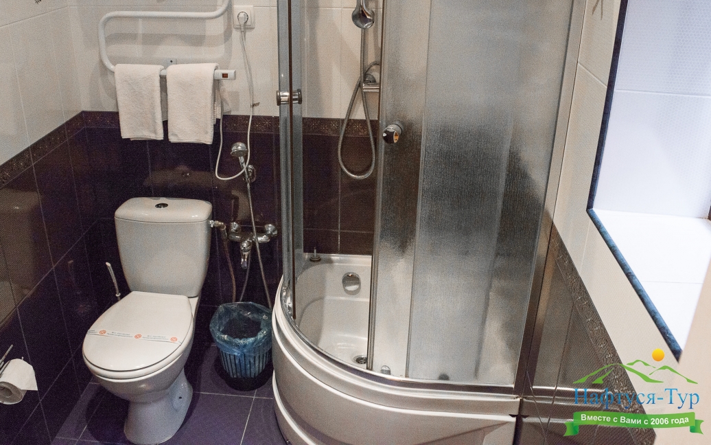 с душевой кабиной, тапочки, фен