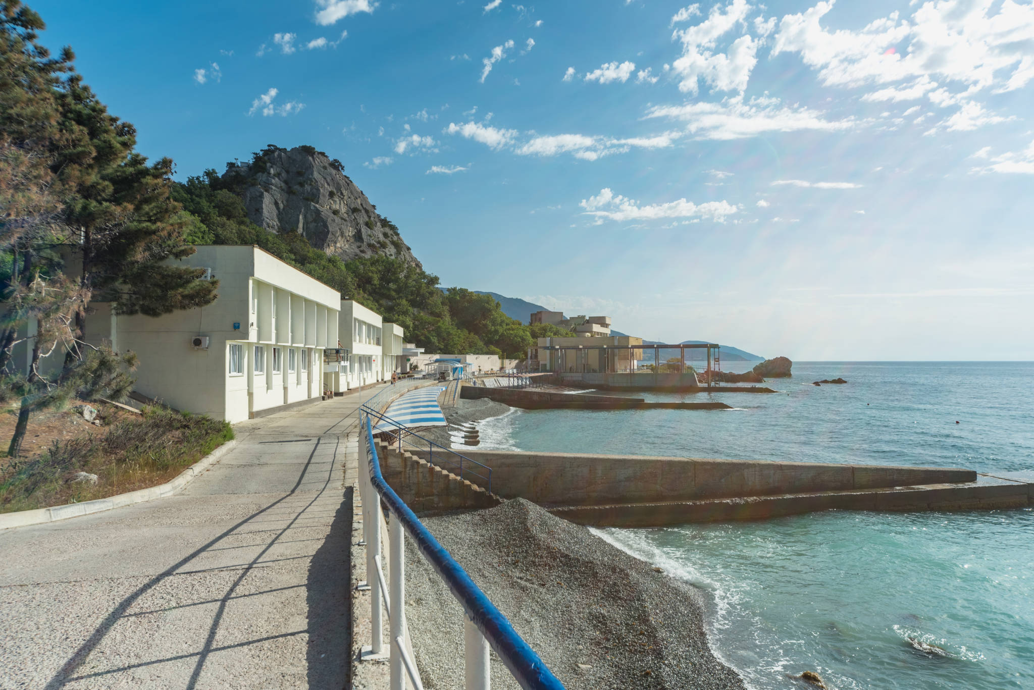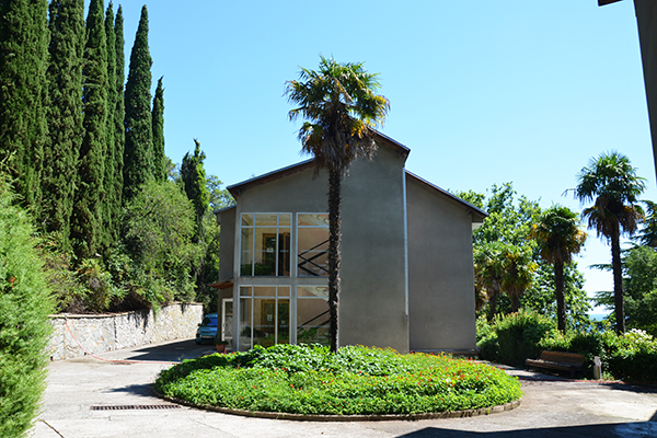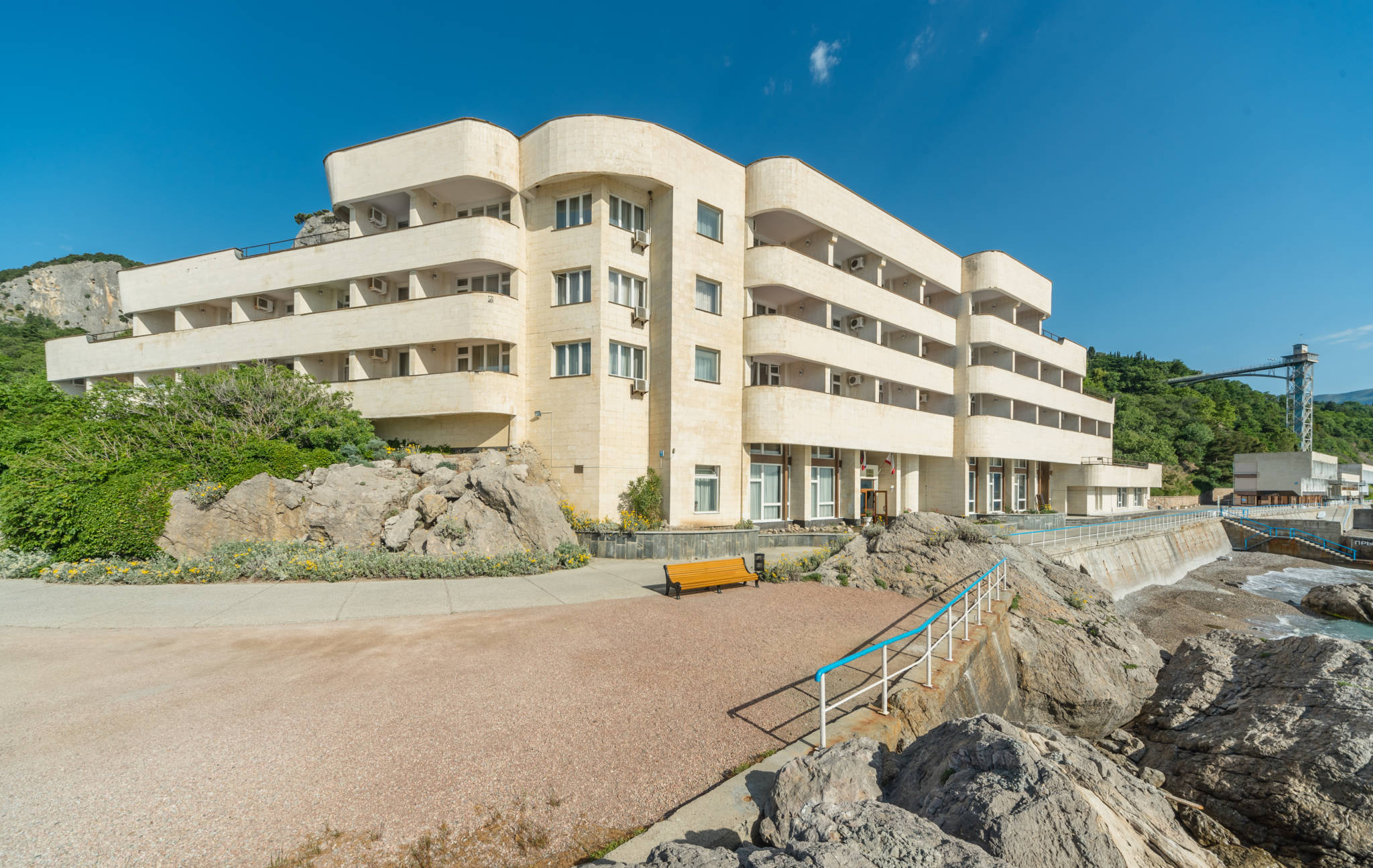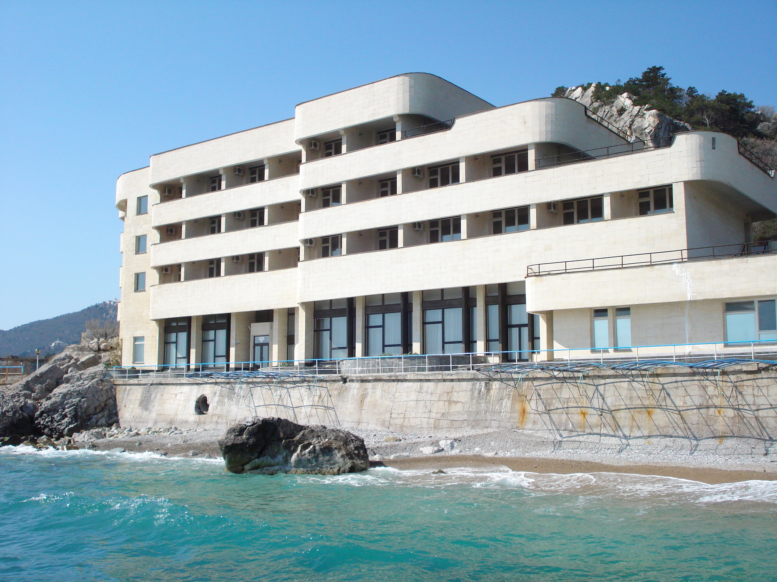 Четыре спальных корпуса курортно-оздоровительного корпуса, обращенные фасадами к морю, удачно вписываются в горный ландшафт.