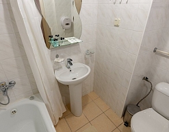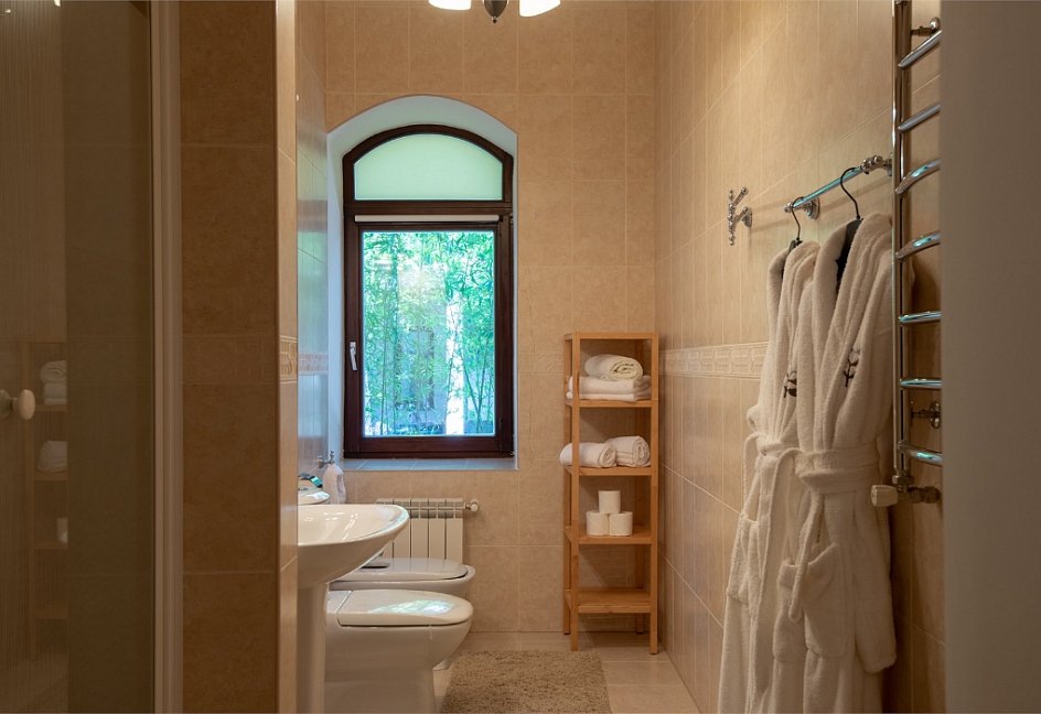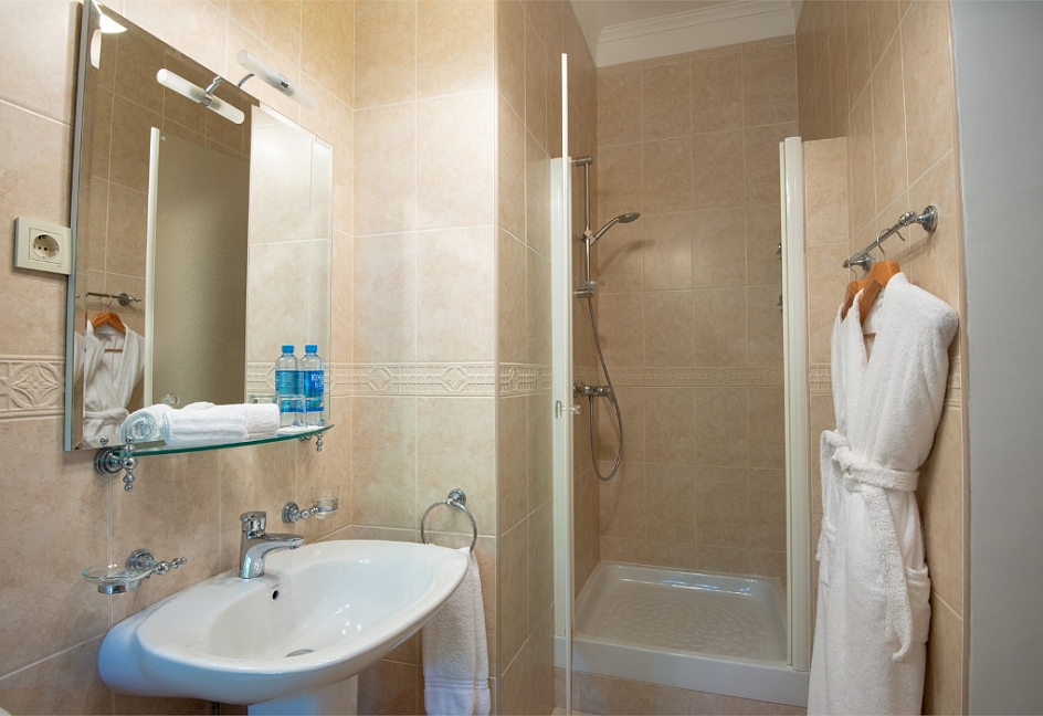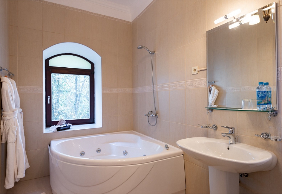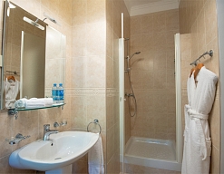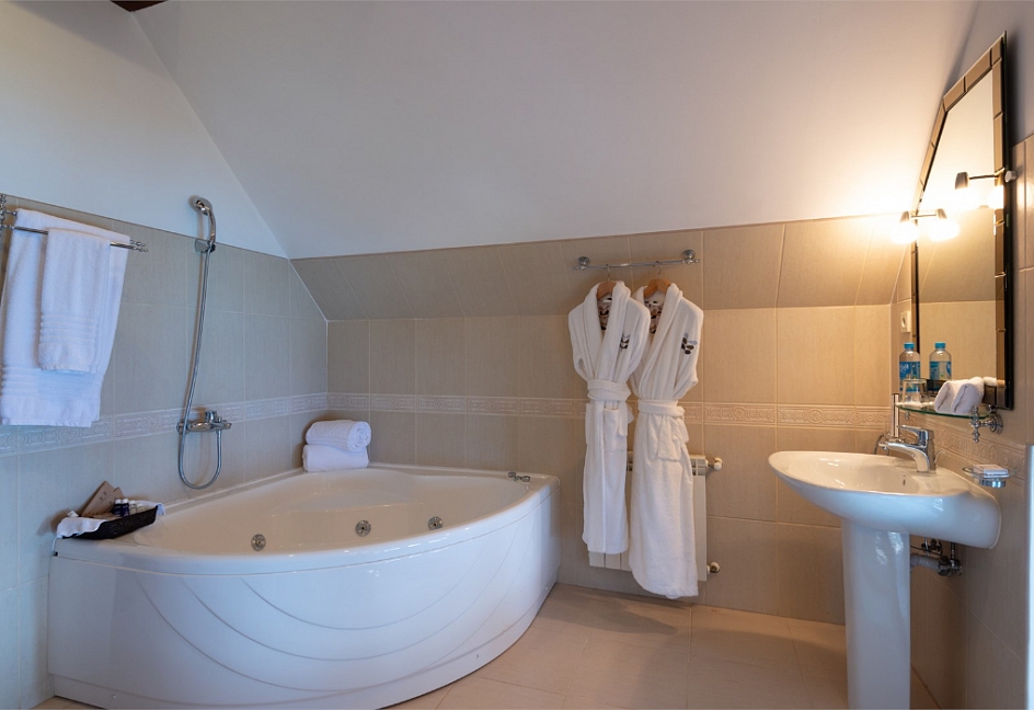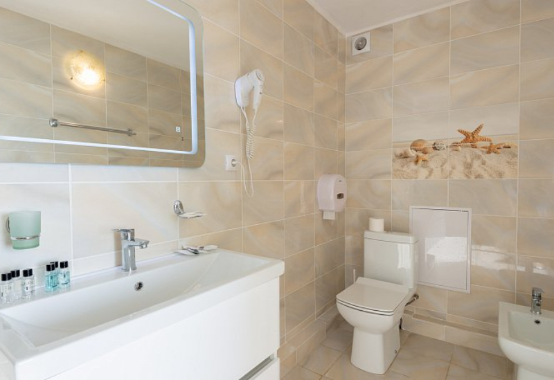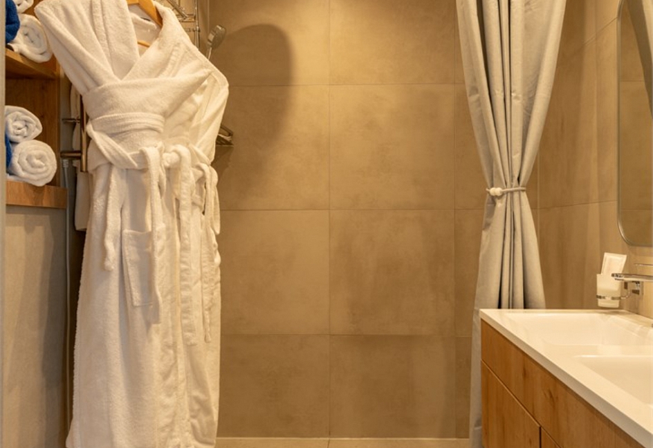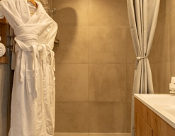 с душем или ванной, туалетные принадлежности, фен, халат