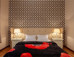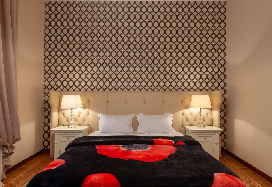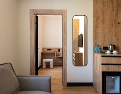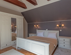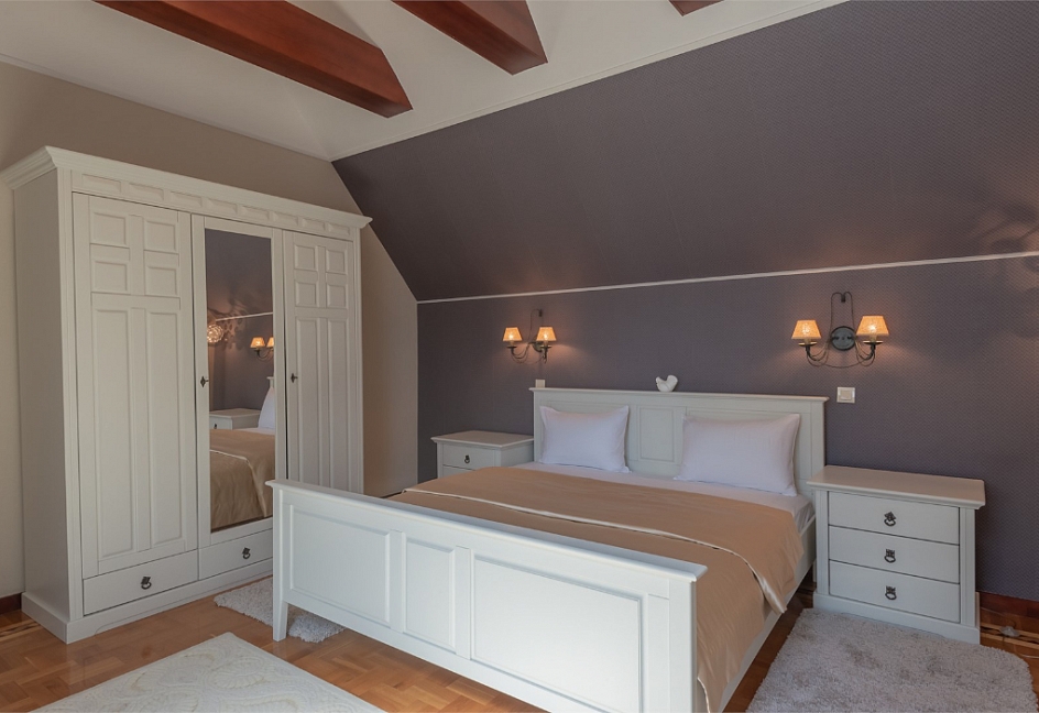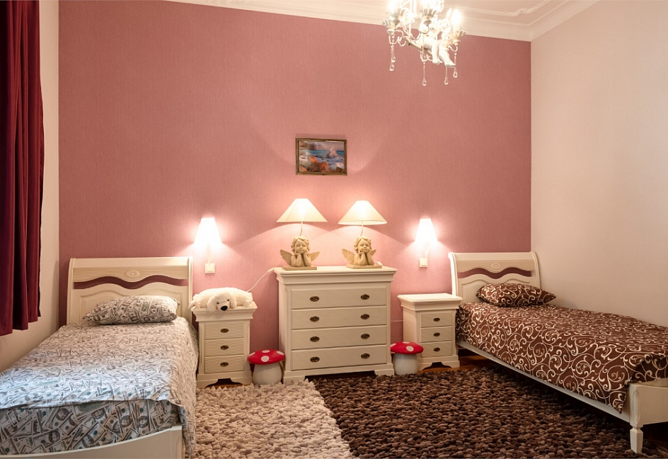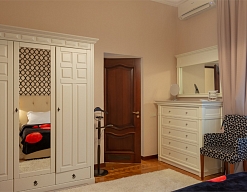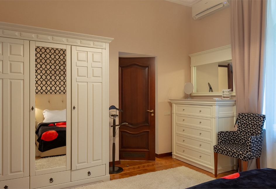 вешалка, зеркало, кресла, кровати односпальные /одна двуспальная кровать, прикроватные тумбочки, стол, шкаф