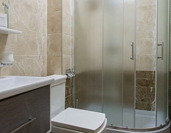 с душем или ванной, тапочки, туалетные принадлежности, фен
