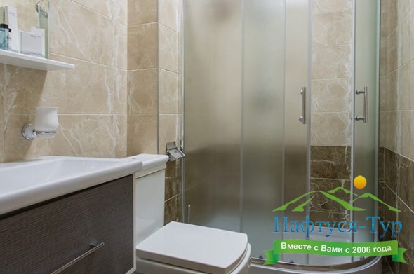 с душем или ванной, тапочки, туалетные принадлежности, фен, халат
