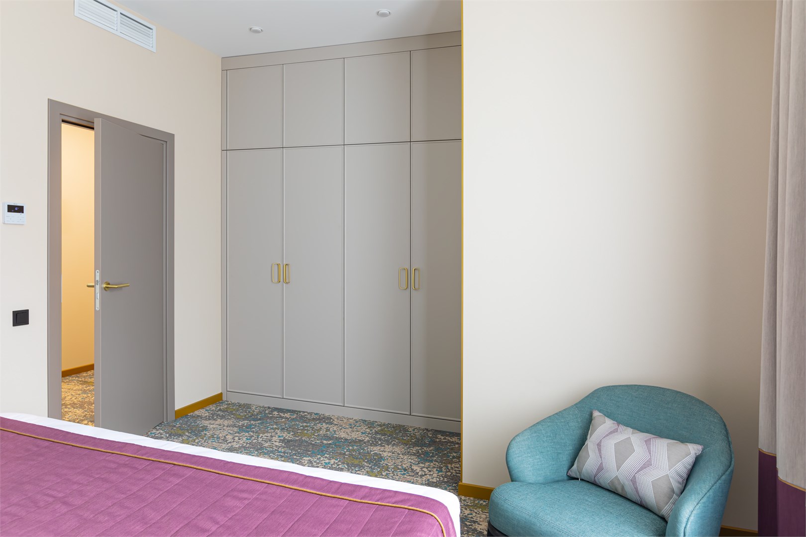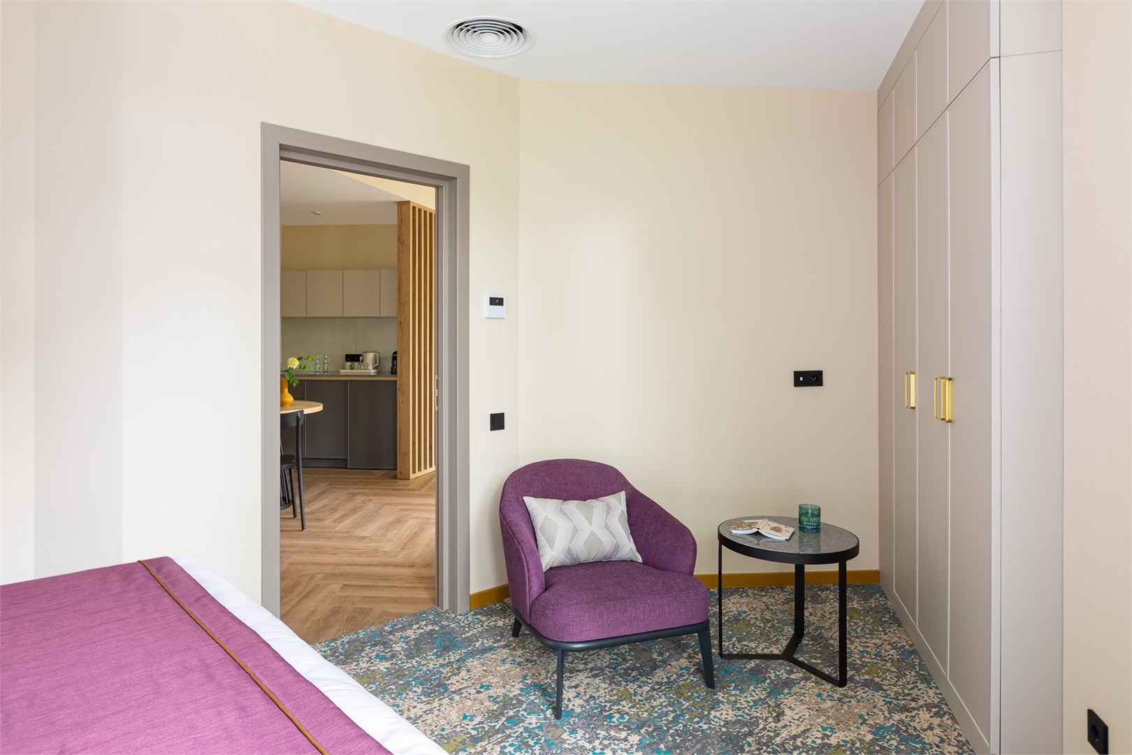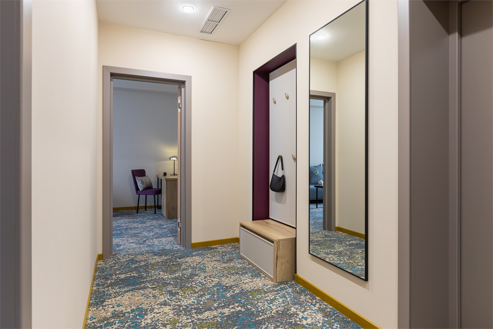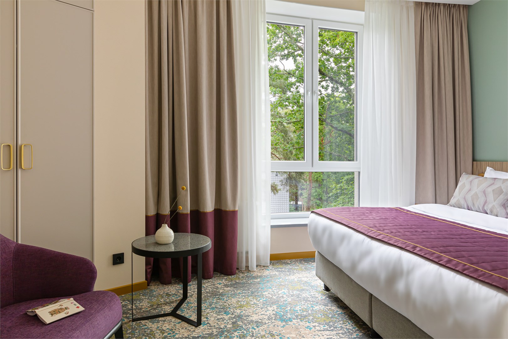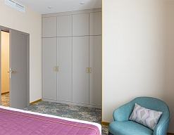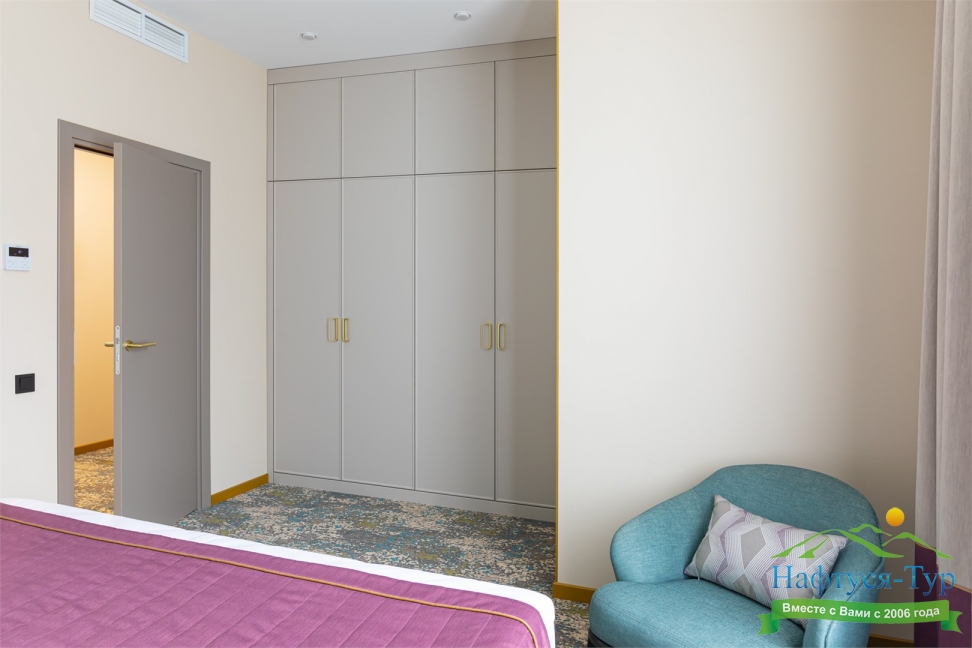 вешалка, зеркало, кресло, кровать двуспальная, прикроватные тумбочки, стол, столик журнальный, стул, шкаф