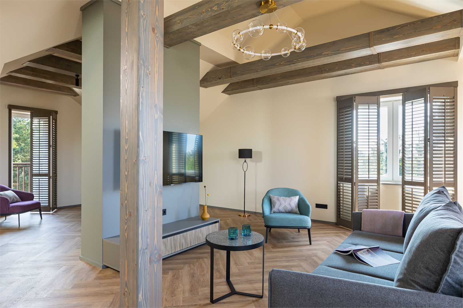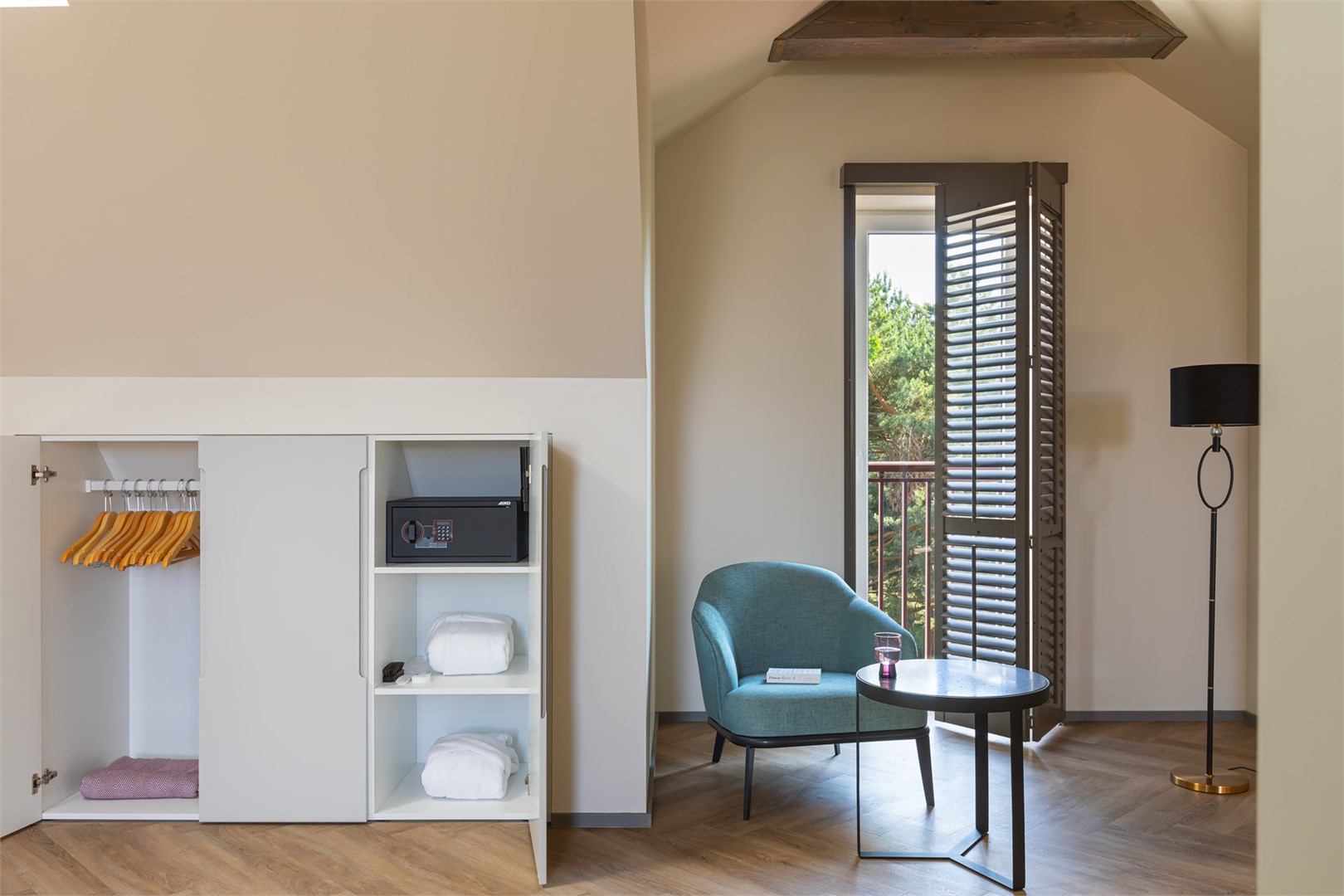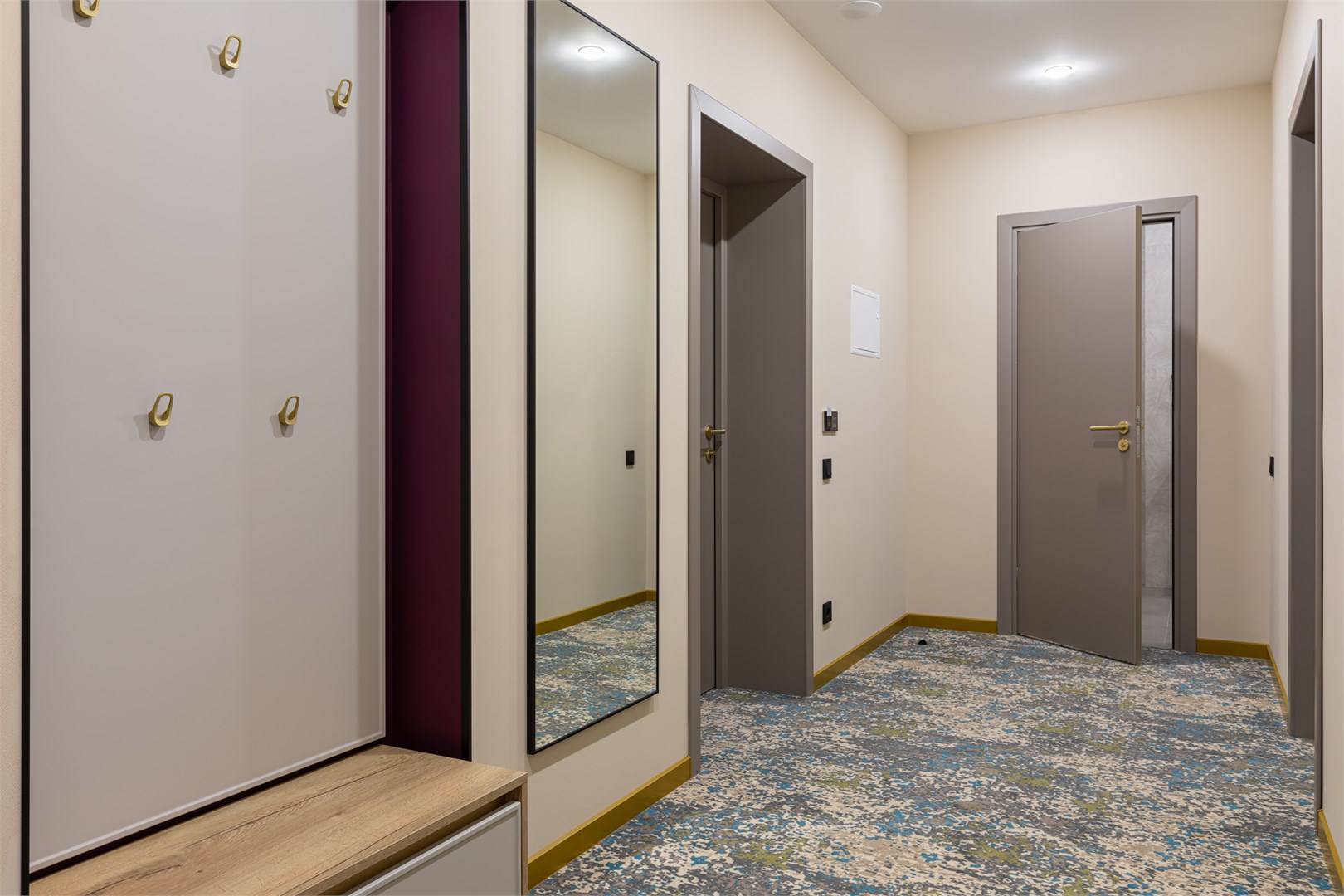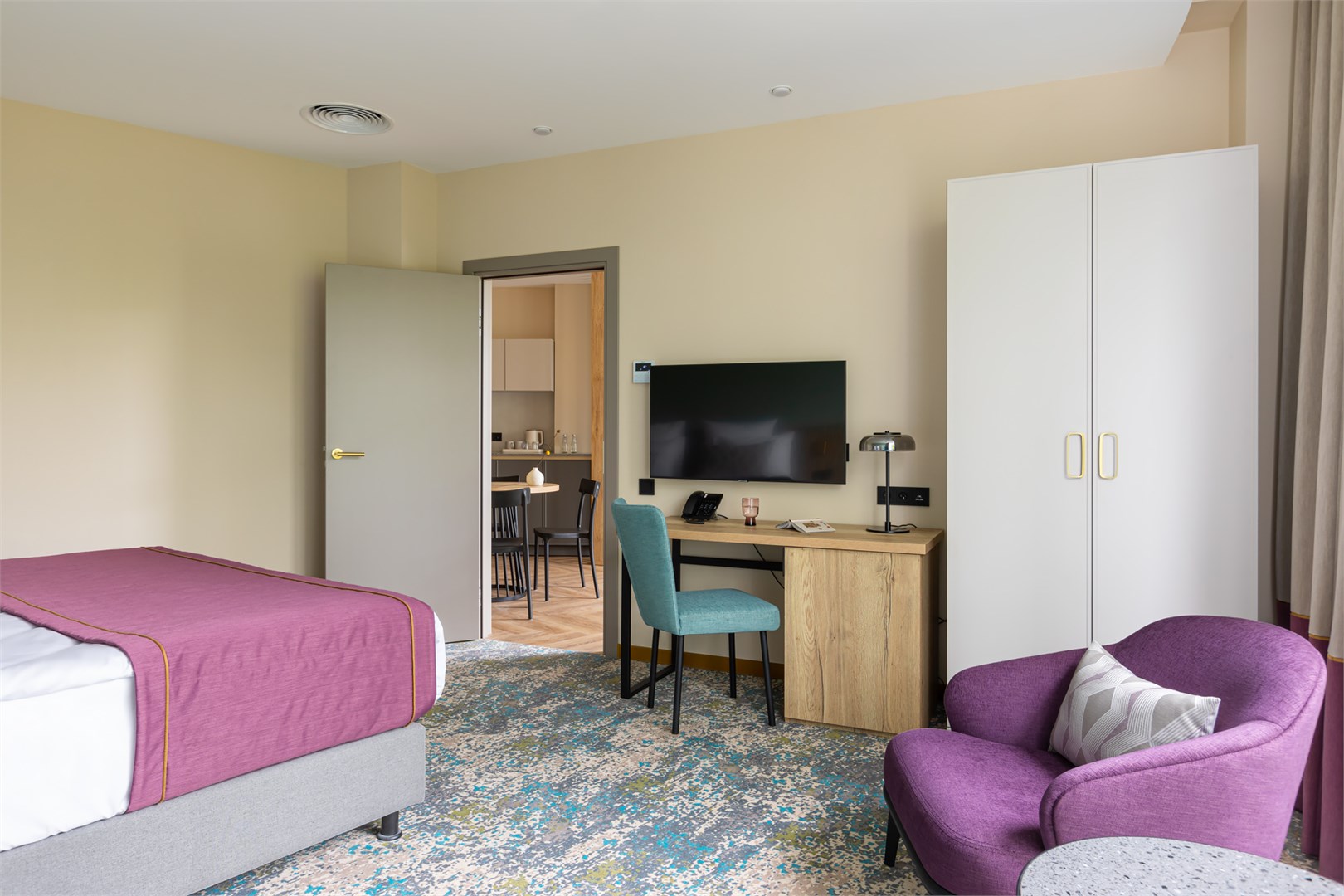 вешалка, зеркало, кресло, кровать двуспальная, прикроватные тумбочки, стол, столик журнальный, стул, шкаф
