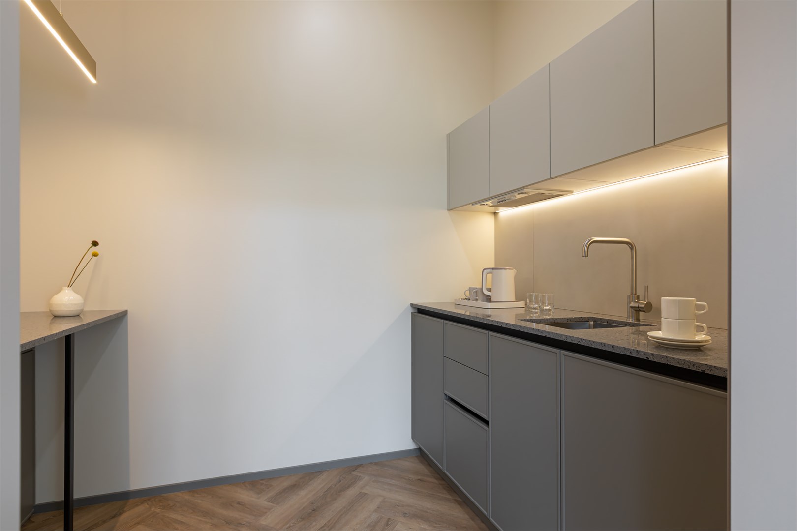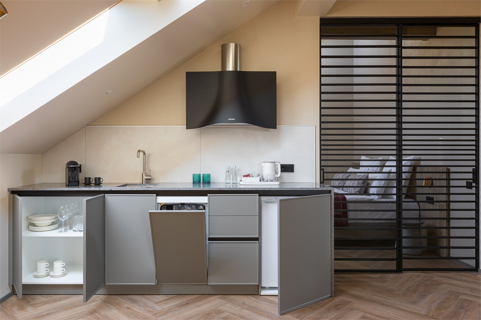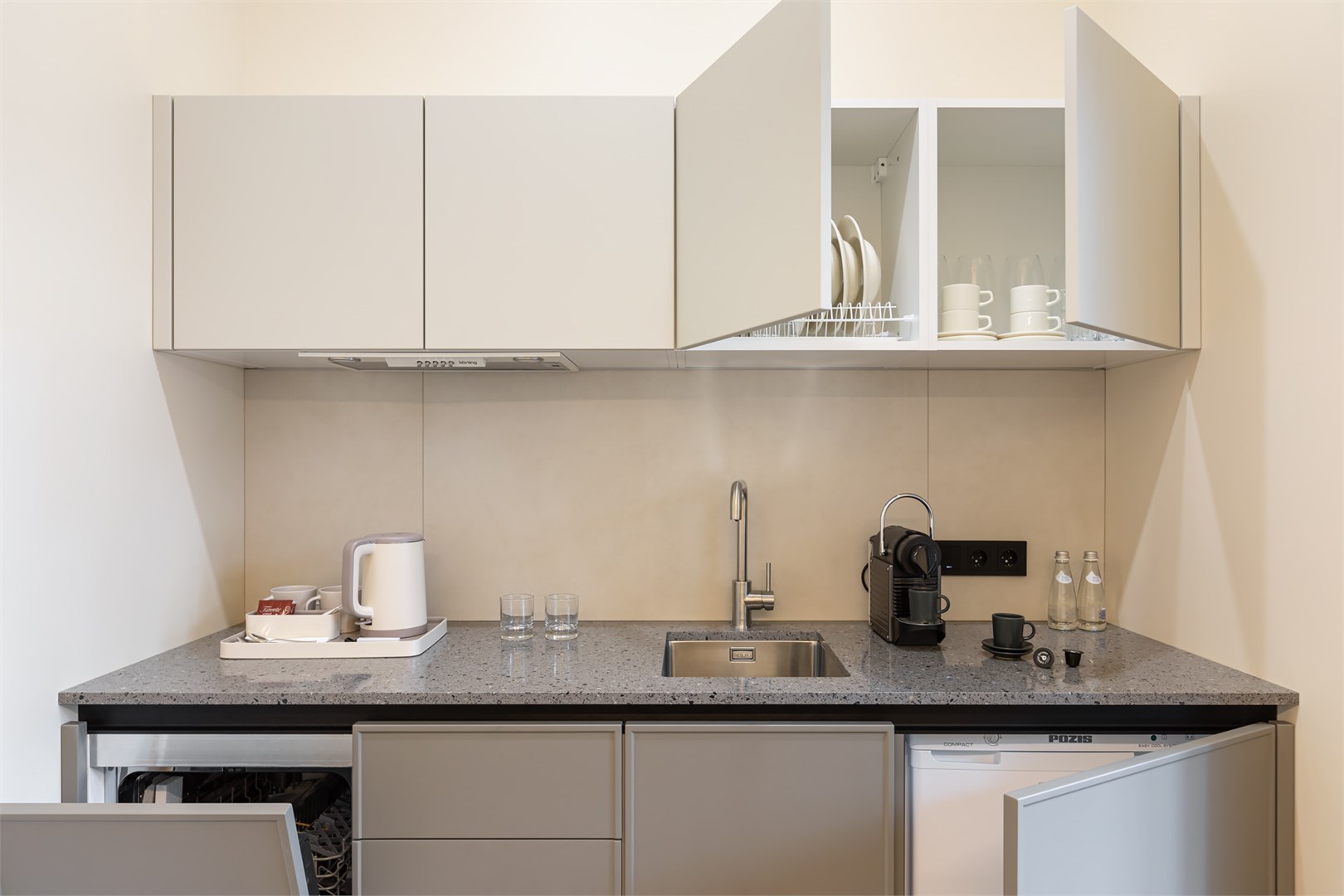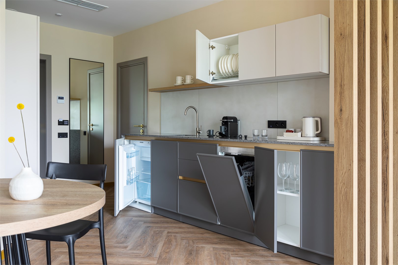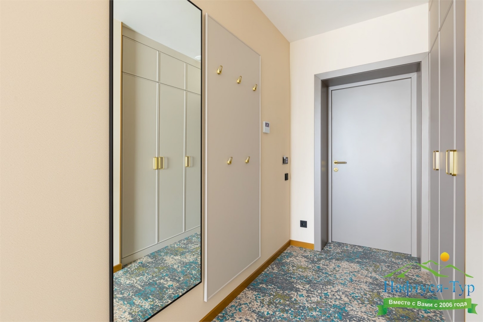 гладильная доска, кофемашина, мини-холодильник, набор посуды, посудомоечная машина, сейф, система общего кондиционирования, телевизор ЖК, телефон, теплый пол, утюг, чайный набор посуды, электрочайник