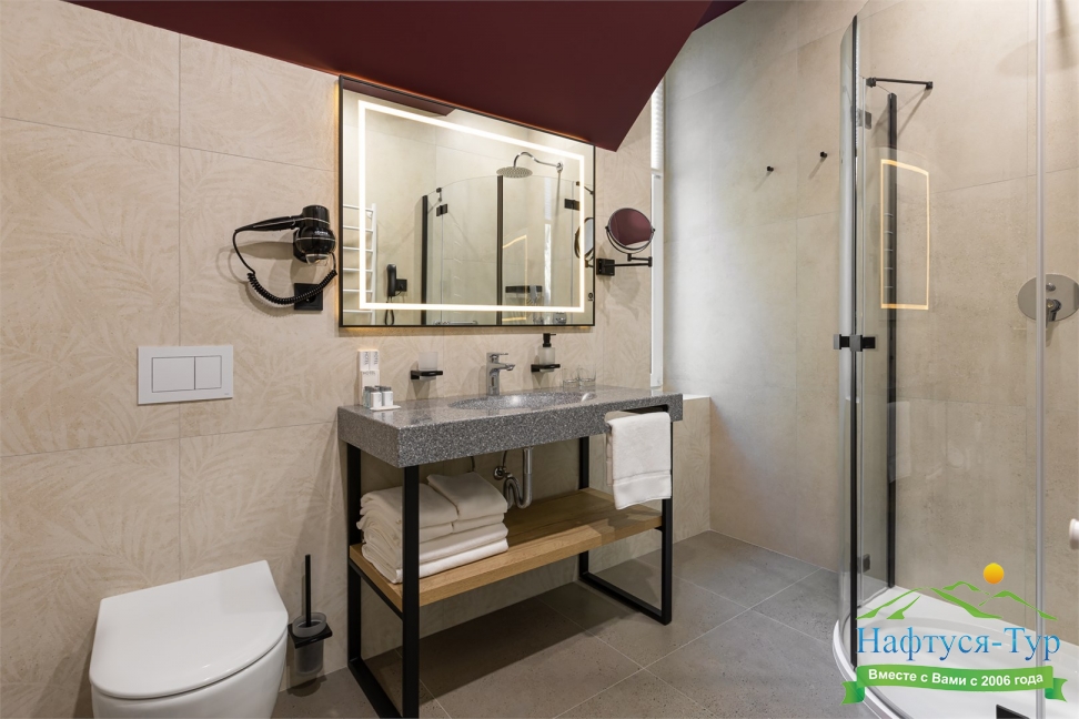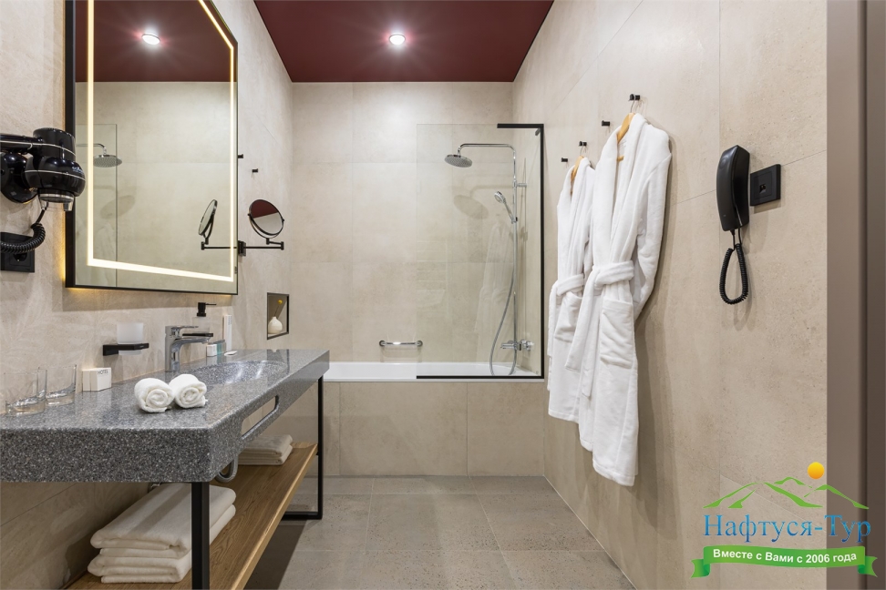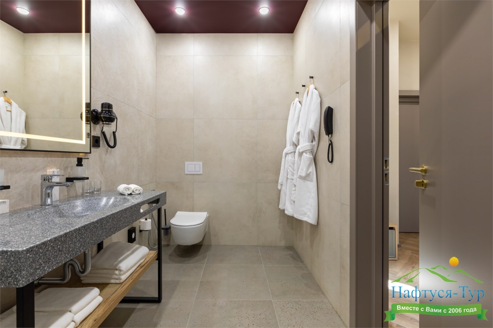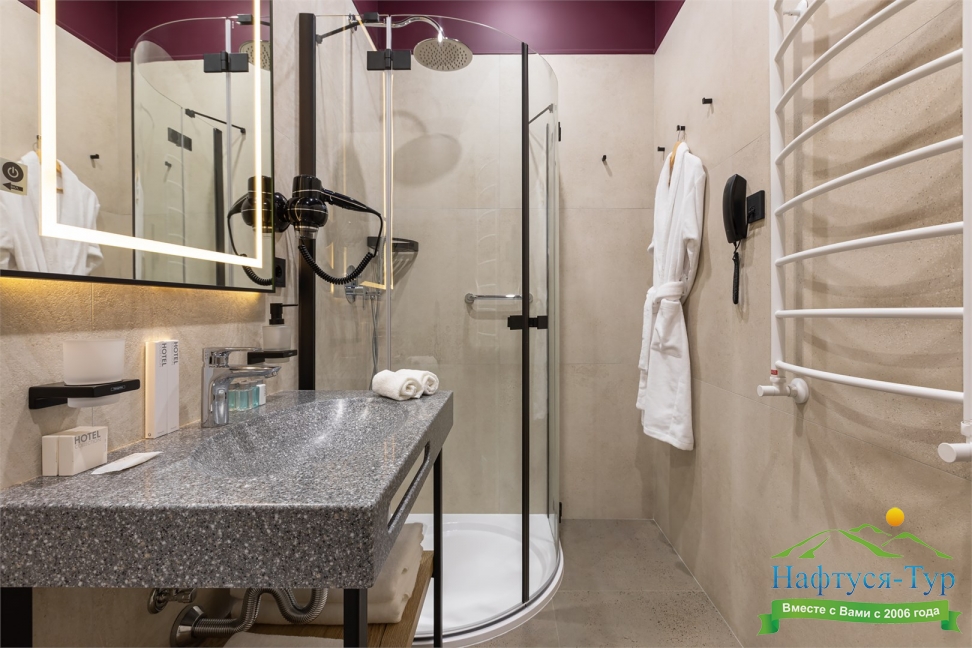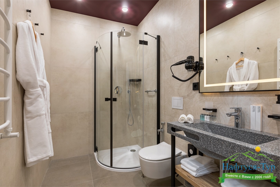 с душем, тапочки, теплый пол, туалетные принадлежности, фен, халат