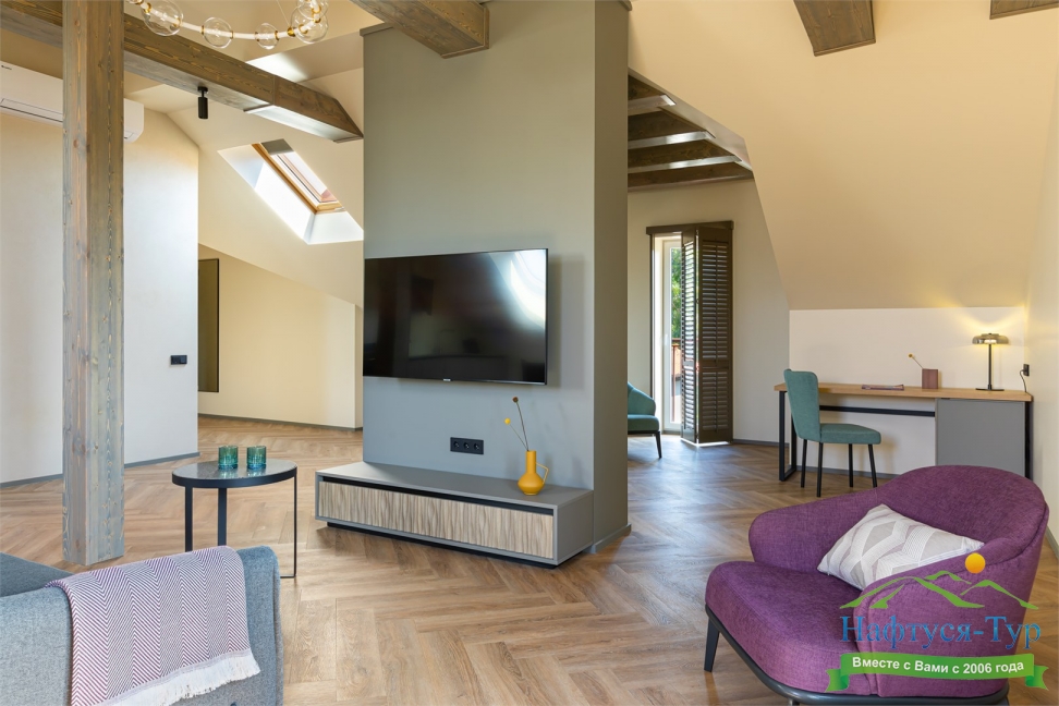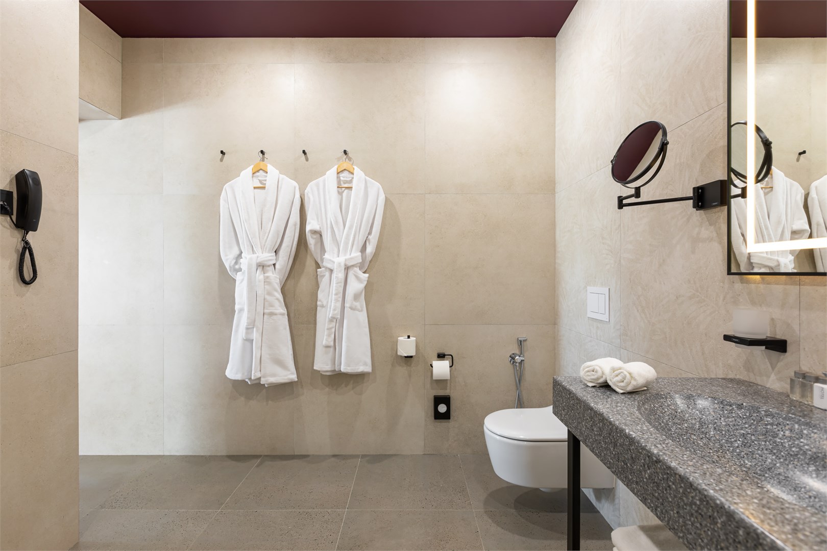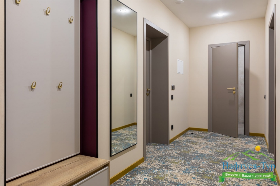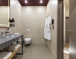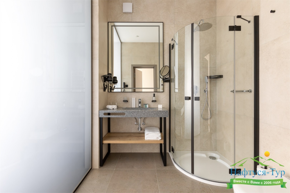 с душем, тапочки, теплый пол, туалетные принадлежности, фен, халат