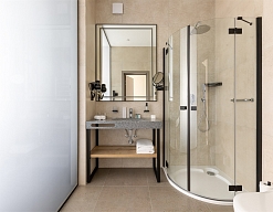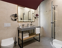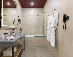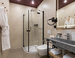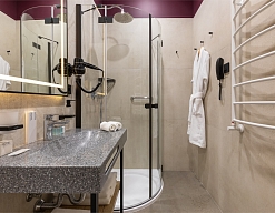 с душем, теплый пол, туалетные принадлежности, фен, халат