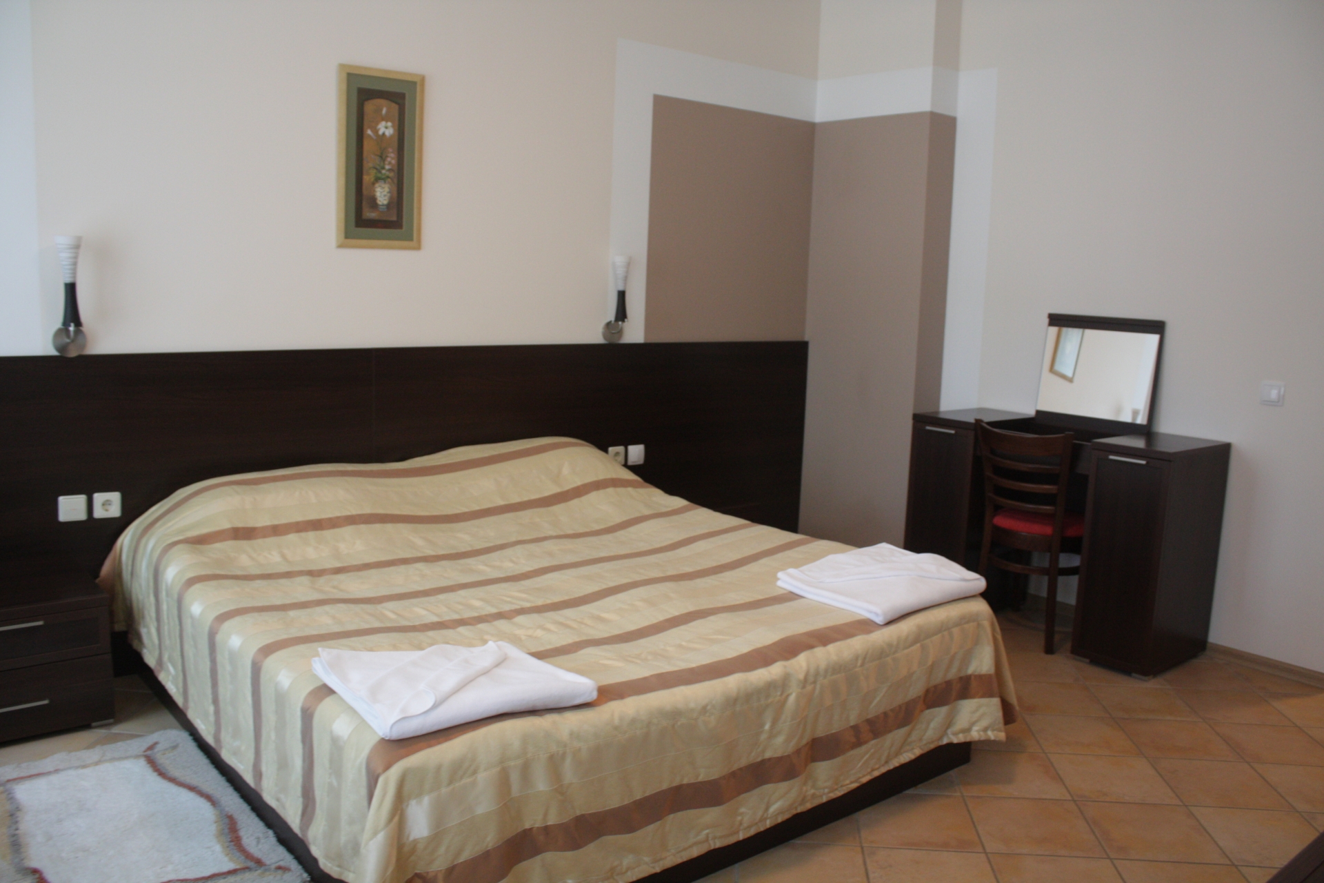 вешалка, диван раскладной, зеркало, кровать двуспальная, прикроватные тумбочки, столик туалетный, шкаф