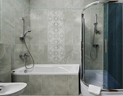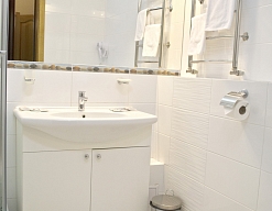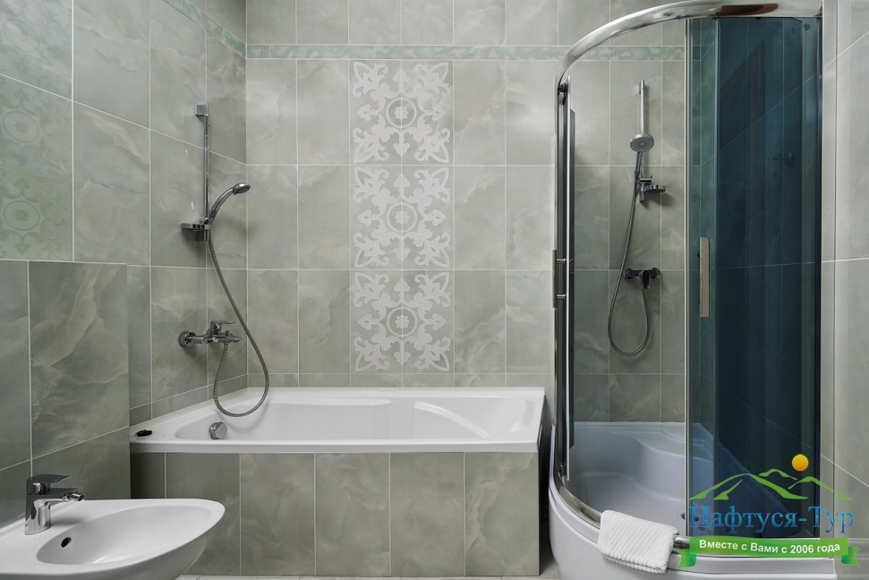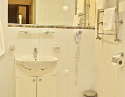 с ванной или душевой кабиной, тапочки, туалетные принадлежности, фен