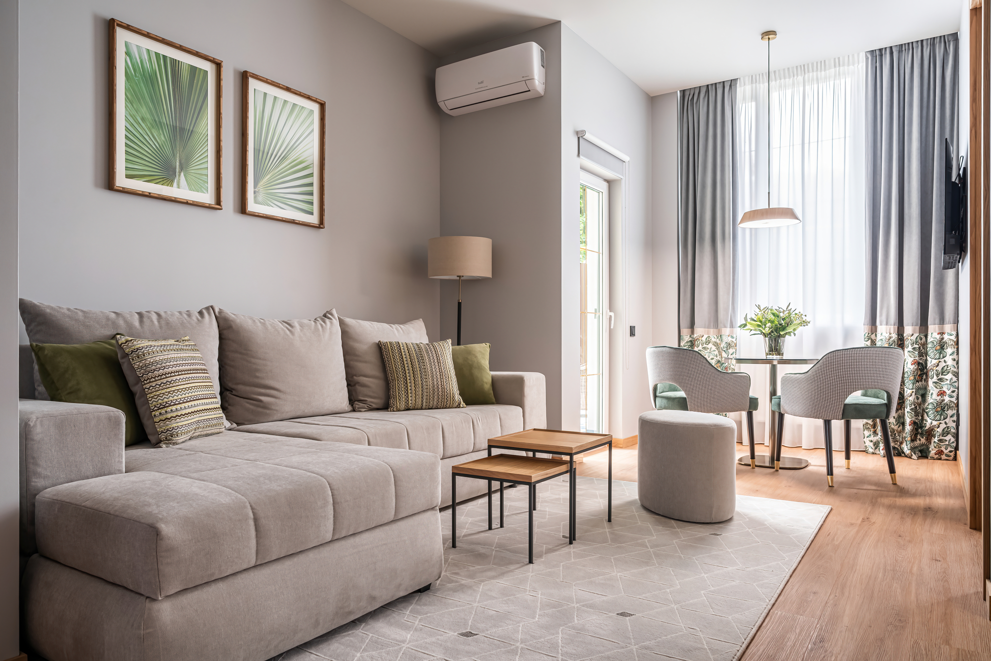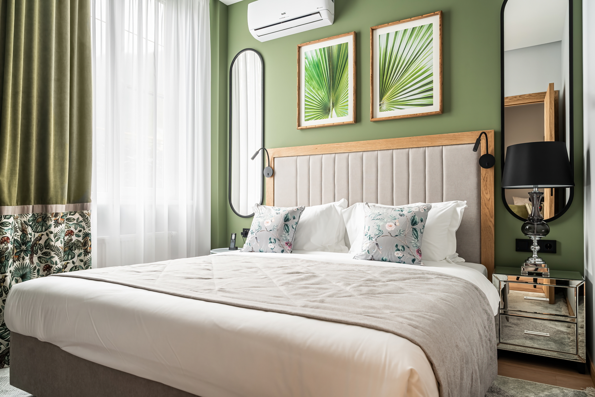 диван, зеркало, кровать двуспальная, прикроватные столики, стол, стулья