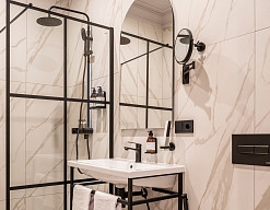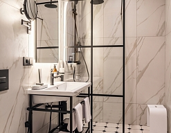 с душевой кабиной, тапочки, туалетные принадлежности, фен, халат