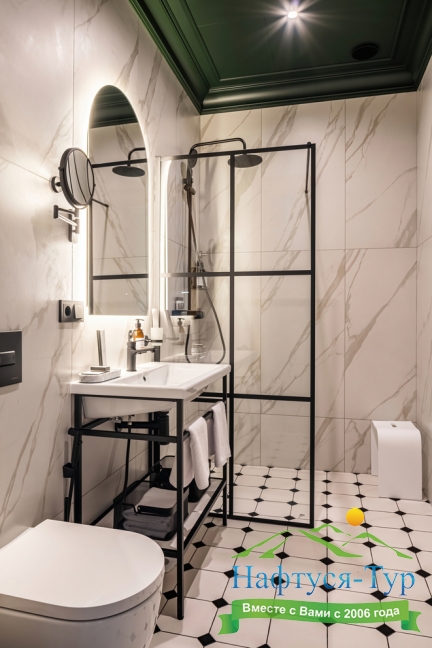 с душем, тапочки, туалетные принадлежности, фен