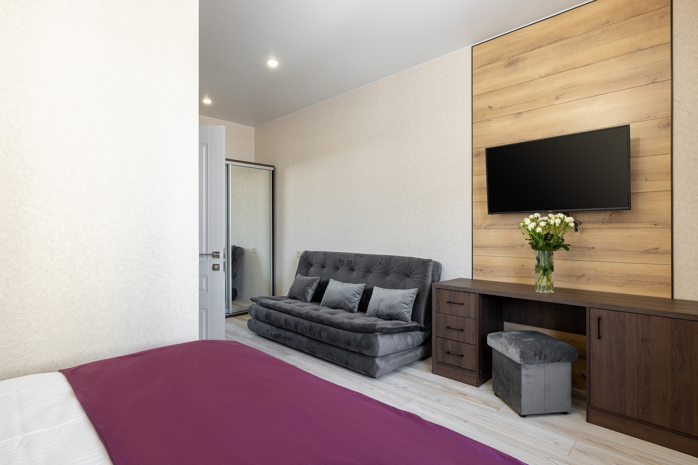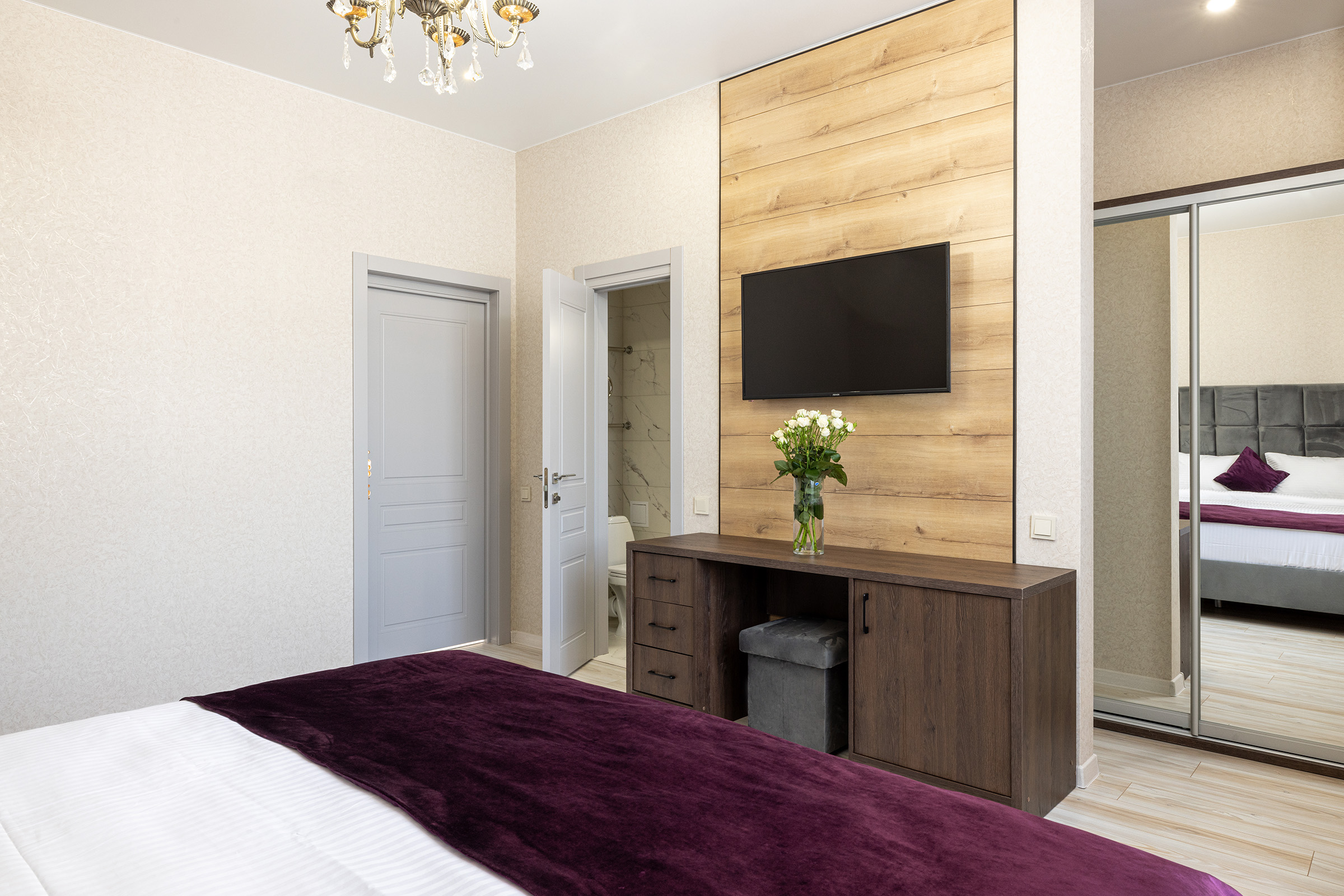 вешалка, кресло, кровать двуспальная, прикроватные тумбочки, стол, шкаф-купе