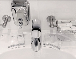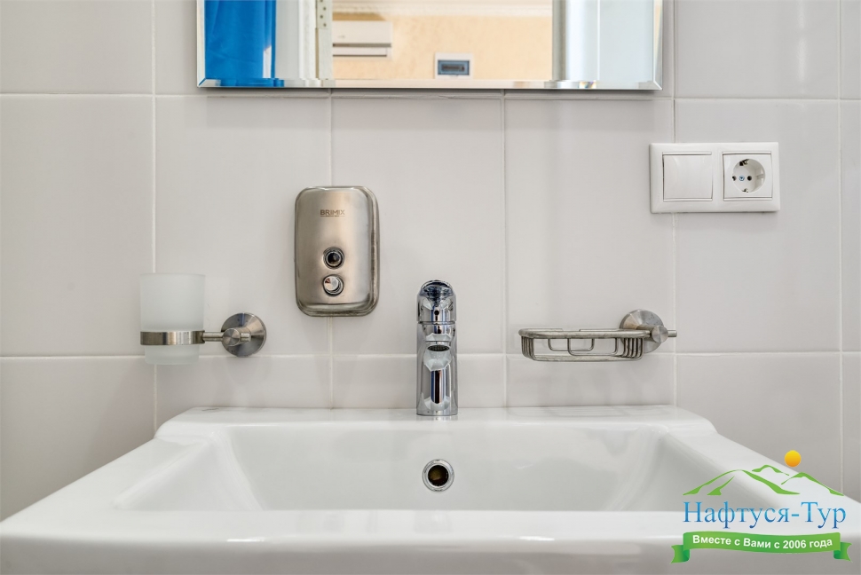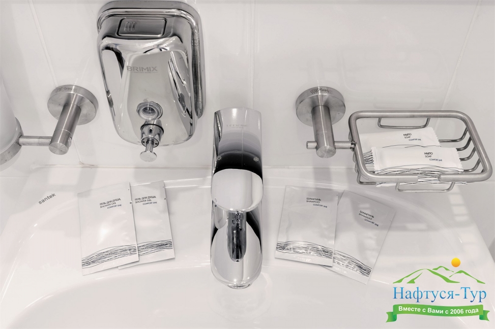 с душем, тапочки, туалетные принадлежности, фен