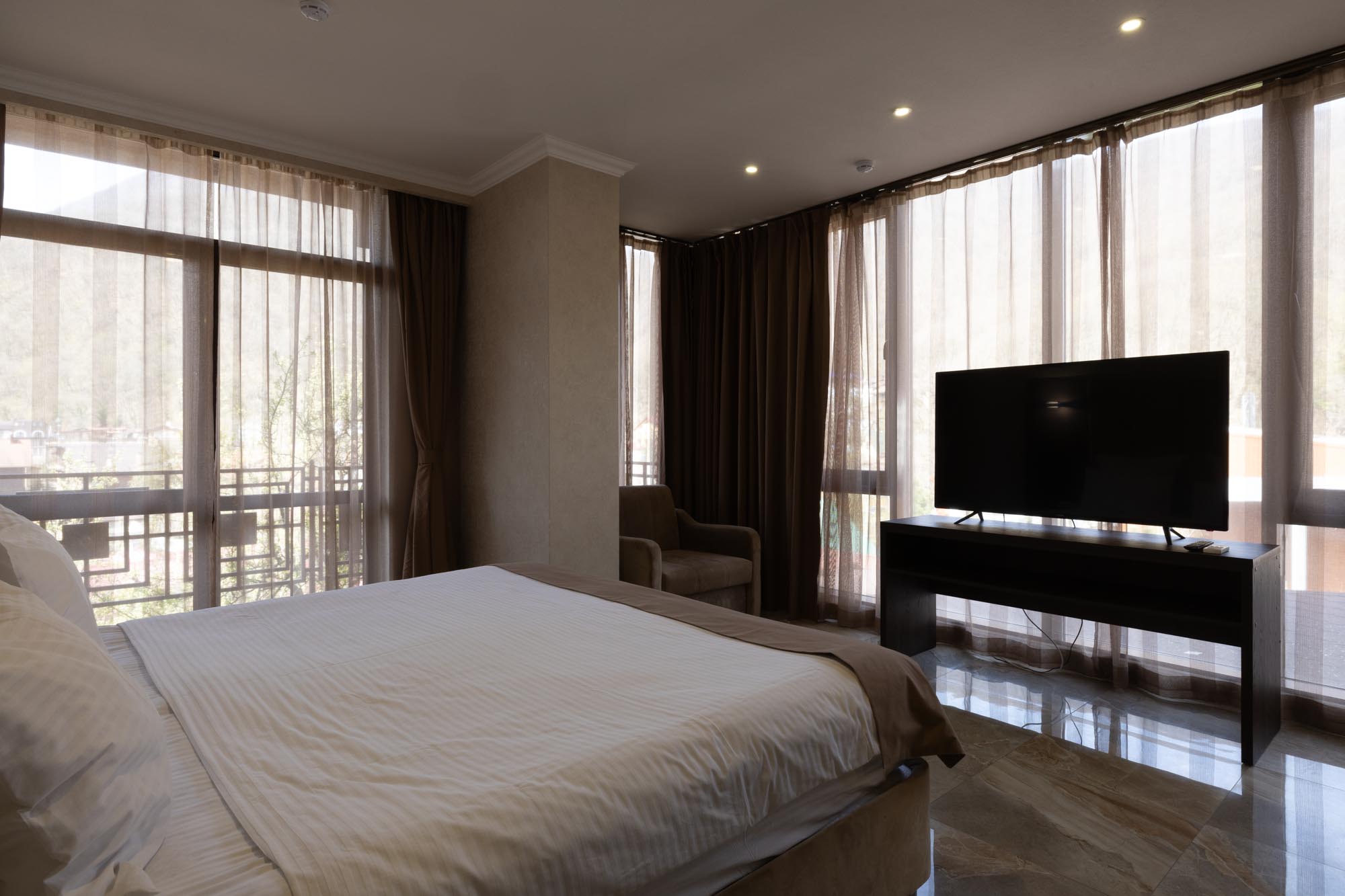 Поездом до ж/д станции Эсто-Садок, далее на автобусе №105, 105с, 535 в направлении: «Роза Хутор» до остановки Мегафон», далее пешком 154 м до отеля.