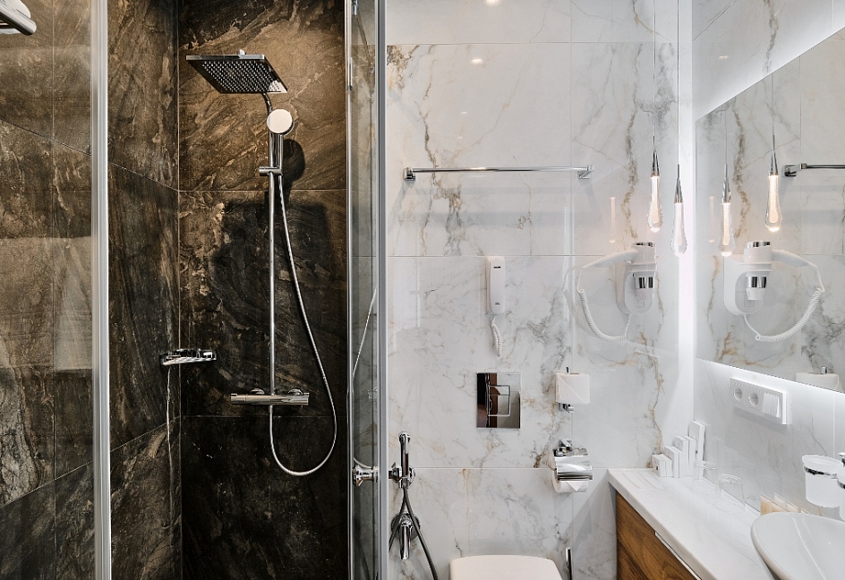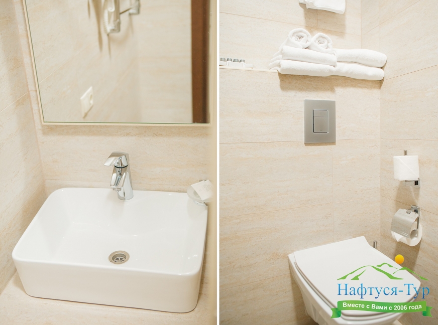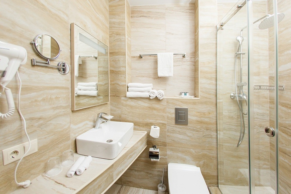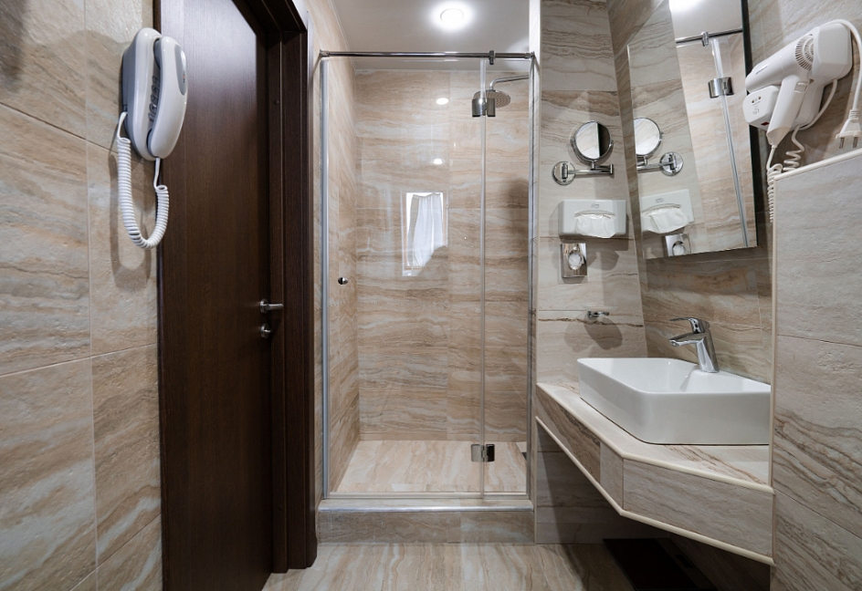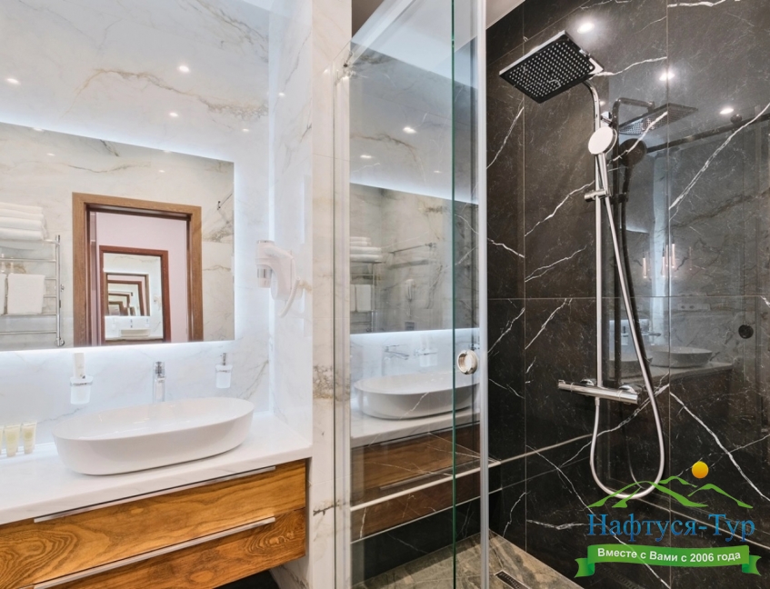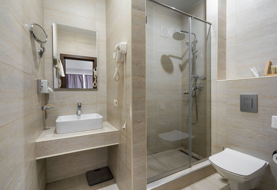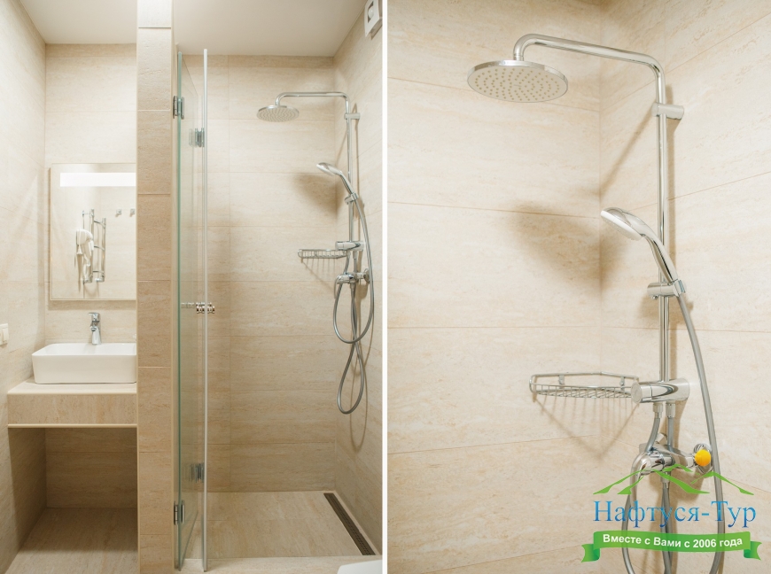 с душем, тапочки, туалетные принадлежности, фен, халат