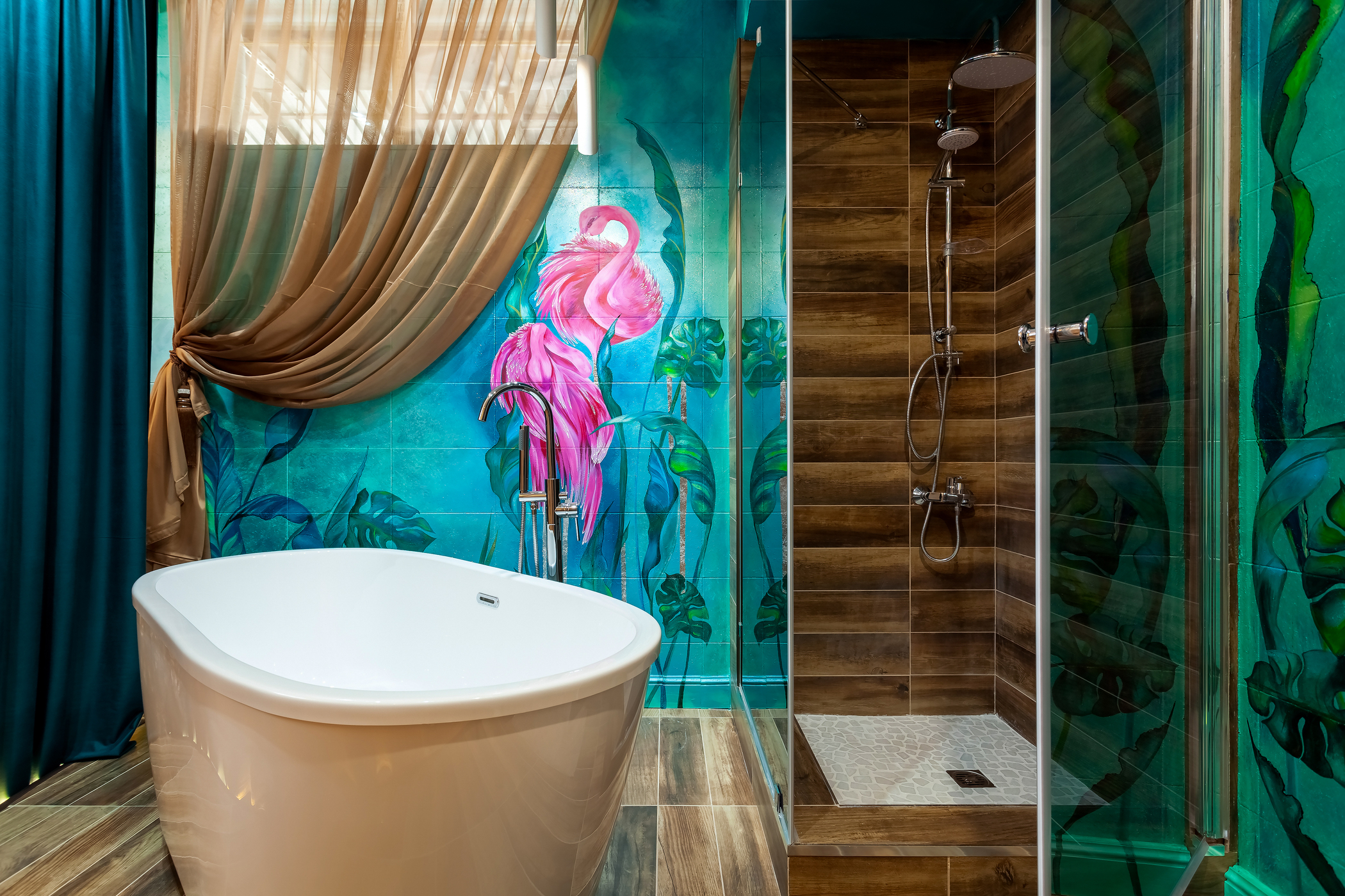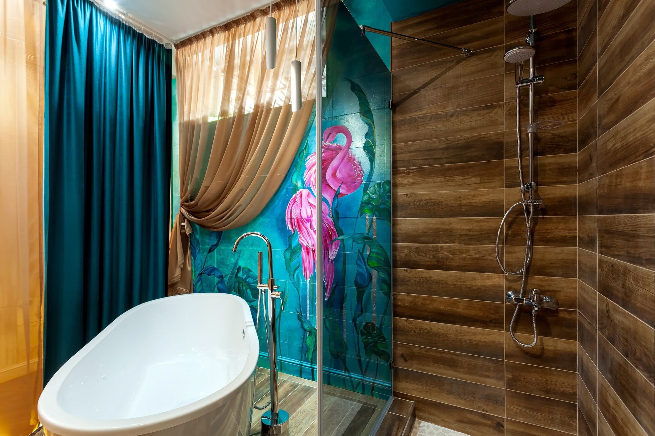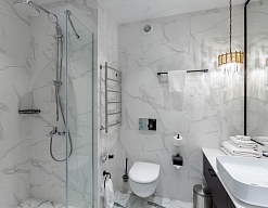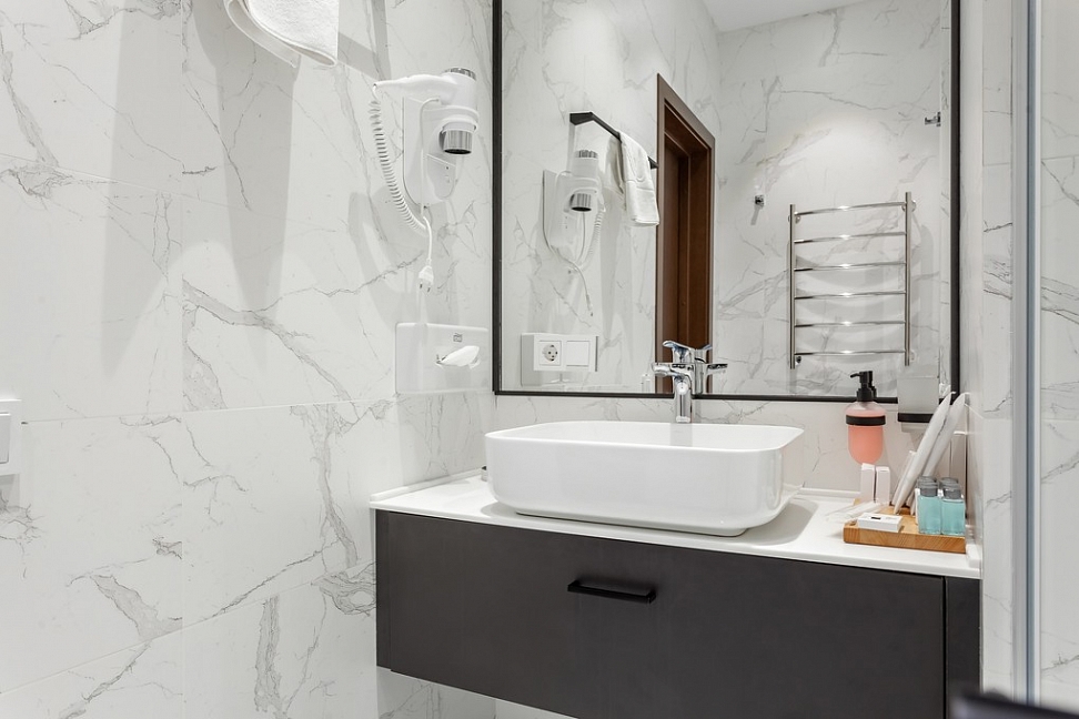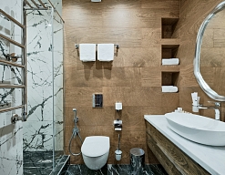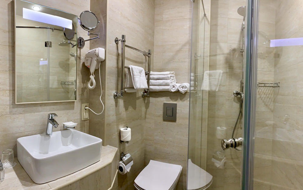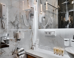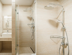 с душем, тапочки, туалетные принадлежности, фен, халат