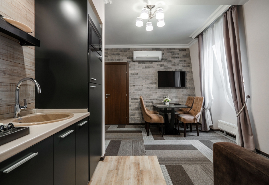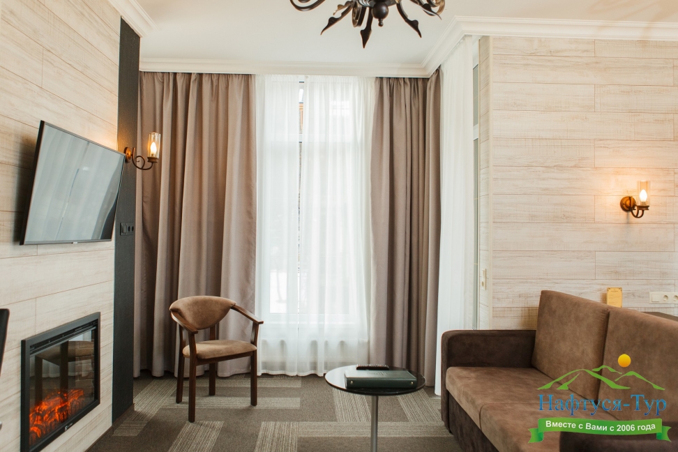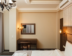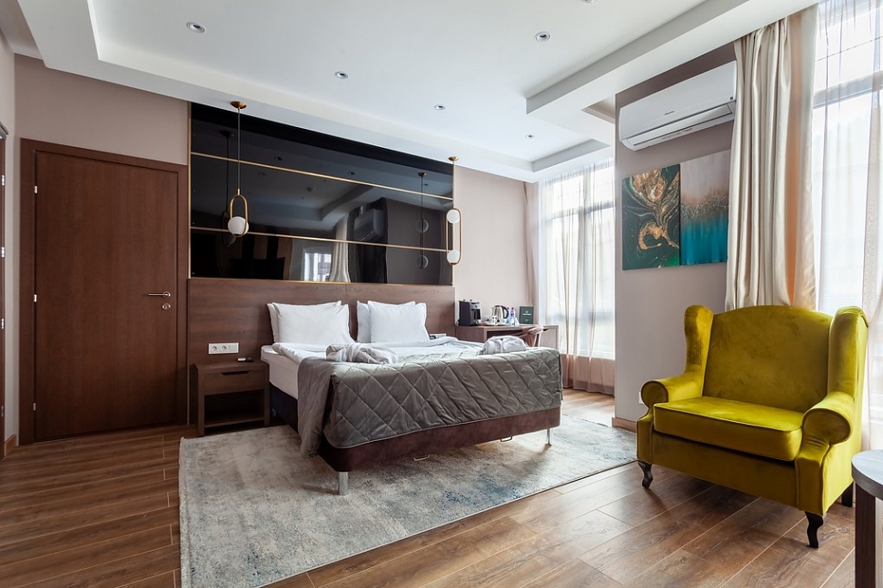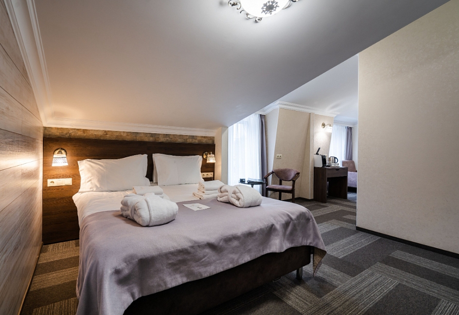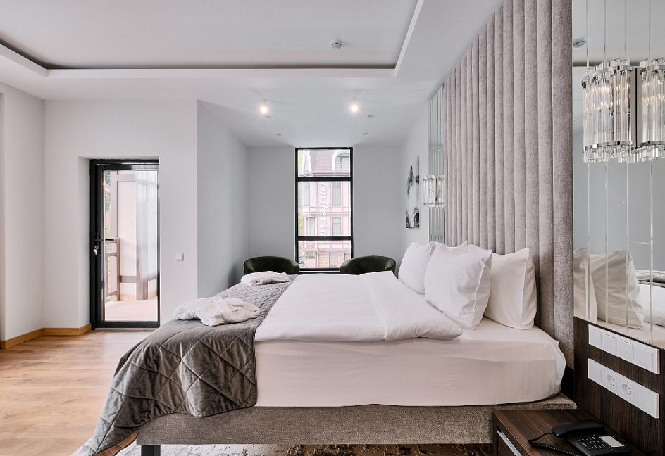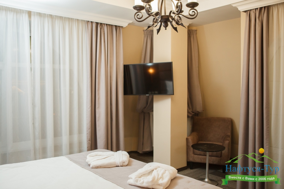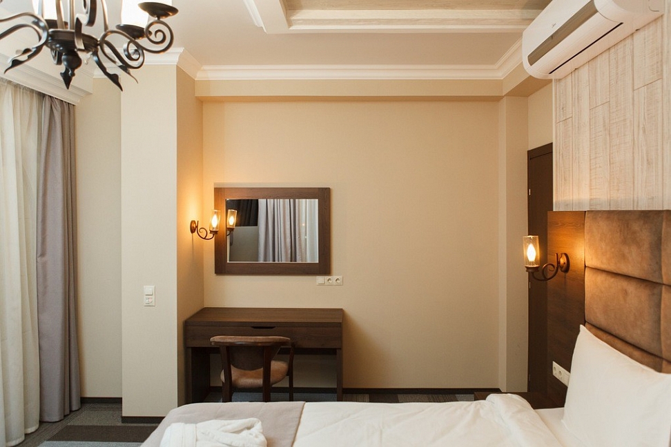 Собственно шикарный номер в шикарном отеле.Отель расположен в отдалении от главной дороги,поэтому здесь тихо.Ухоженная территория с диванами и стульями,небольшая парковка.Даже если на ней не хватает места,можно припарковаться на тротуар за забором.