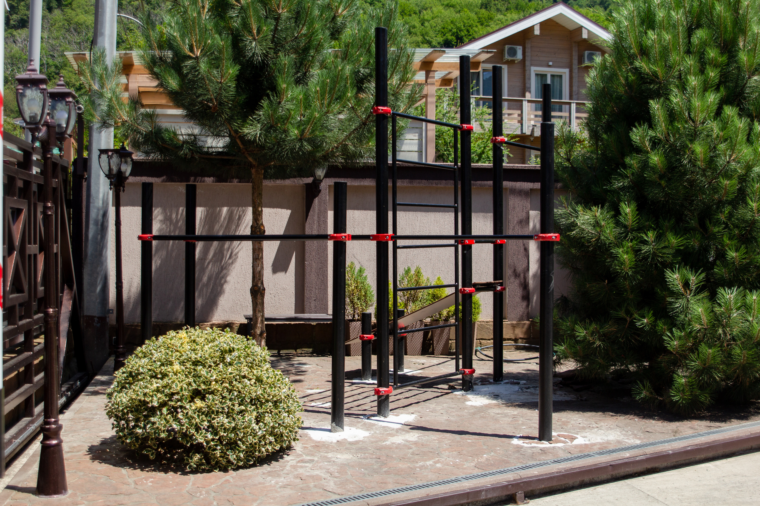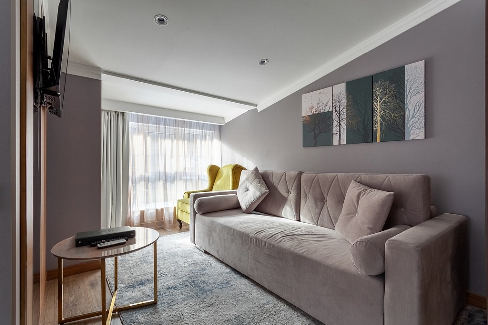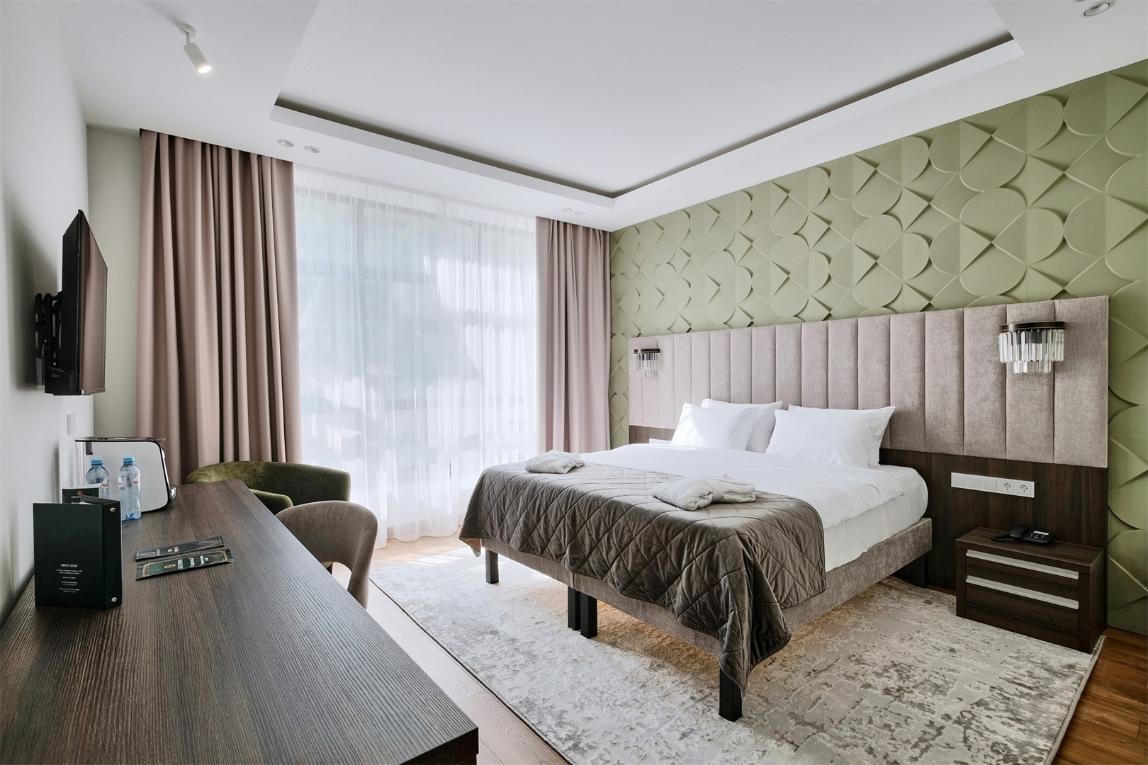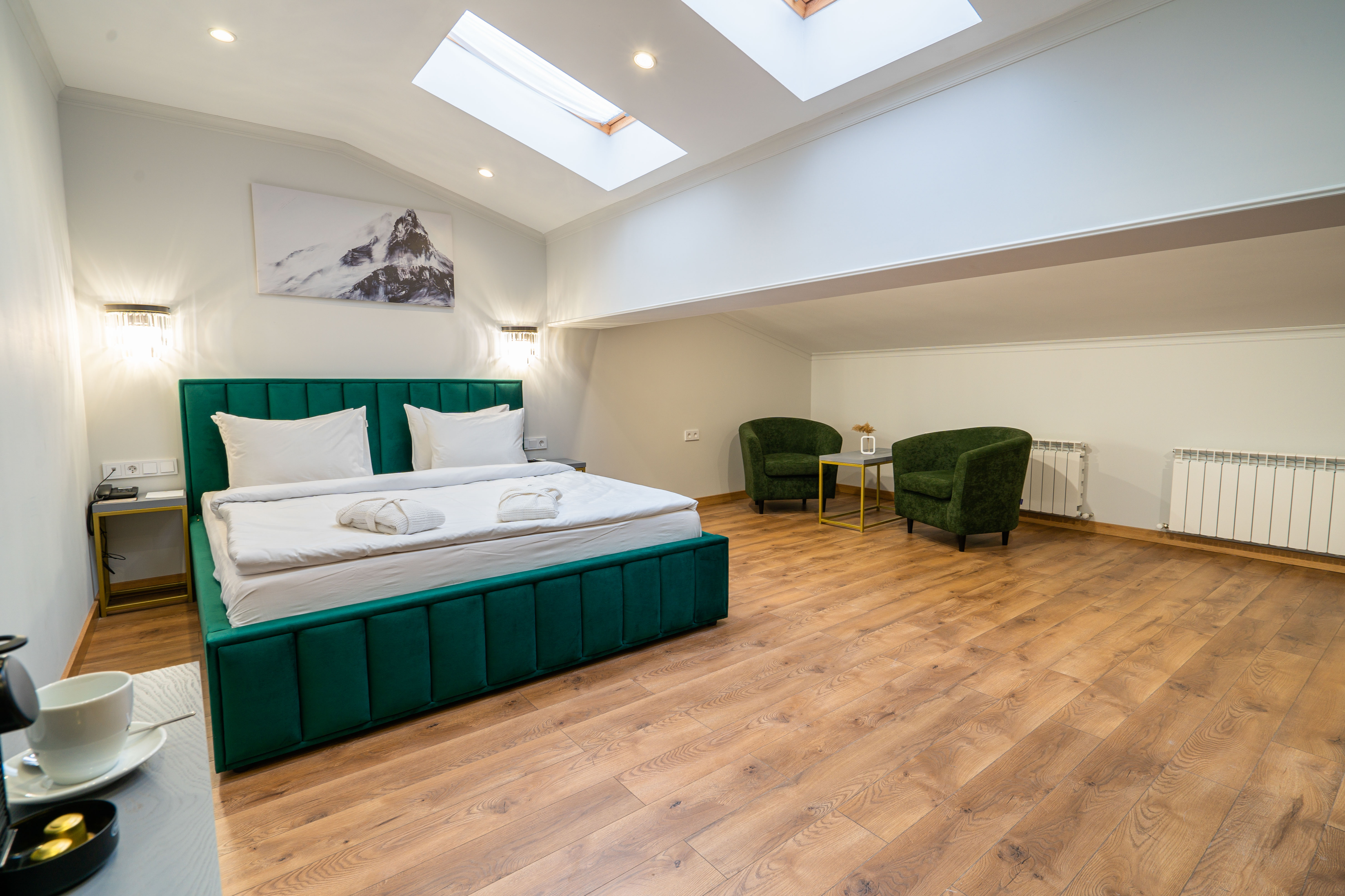Собственно шикарный номер в шикарном отеле.Отель расположен в отдалении от главной дороги,поэтому здесь тихо.Ухоженная территория с диванами и стульями,небольшая парковка.Даже если на ней не хватает места,можно припарковаться на тротуар за забором.