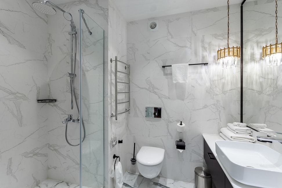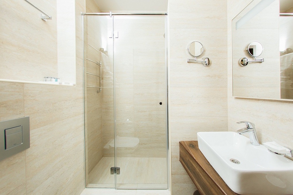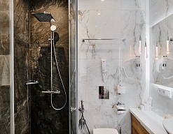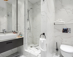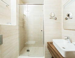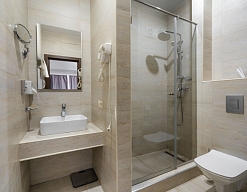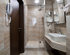 с душевой кабиной, тапочки, туалетные принадлежности, фен, халат