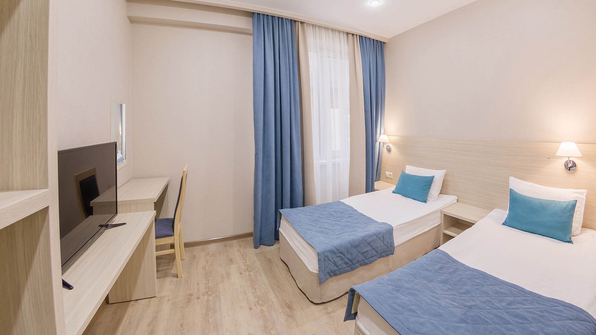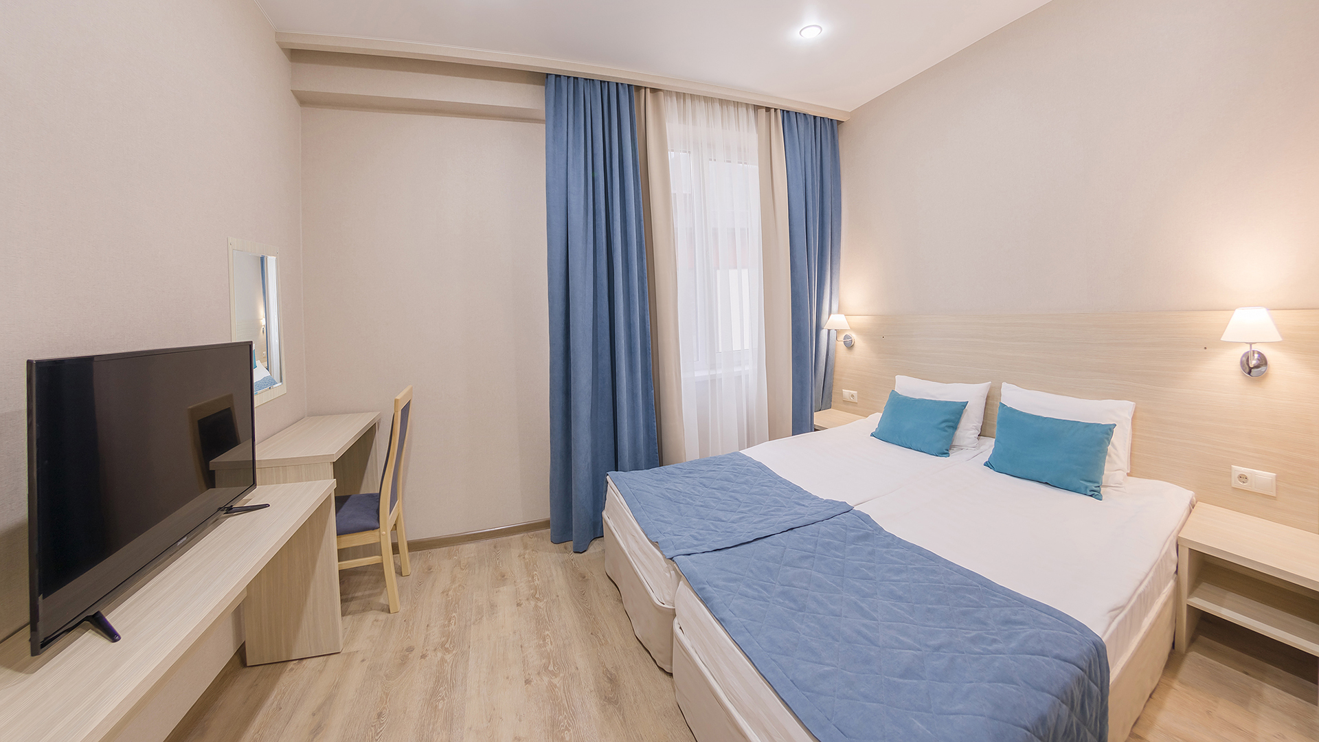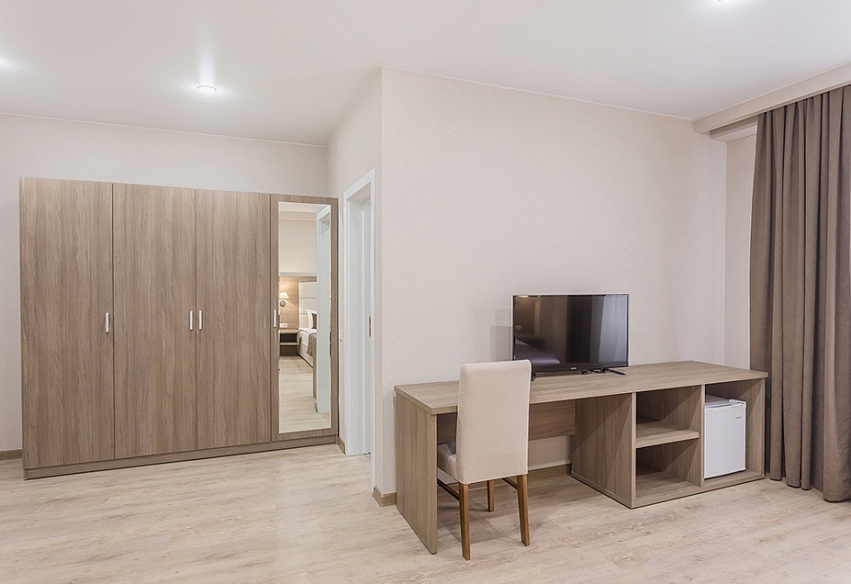 зеркало, кровати односпальные /одна двуспальная кровать, прикроватные тумбочки, стол, стул, шкаф