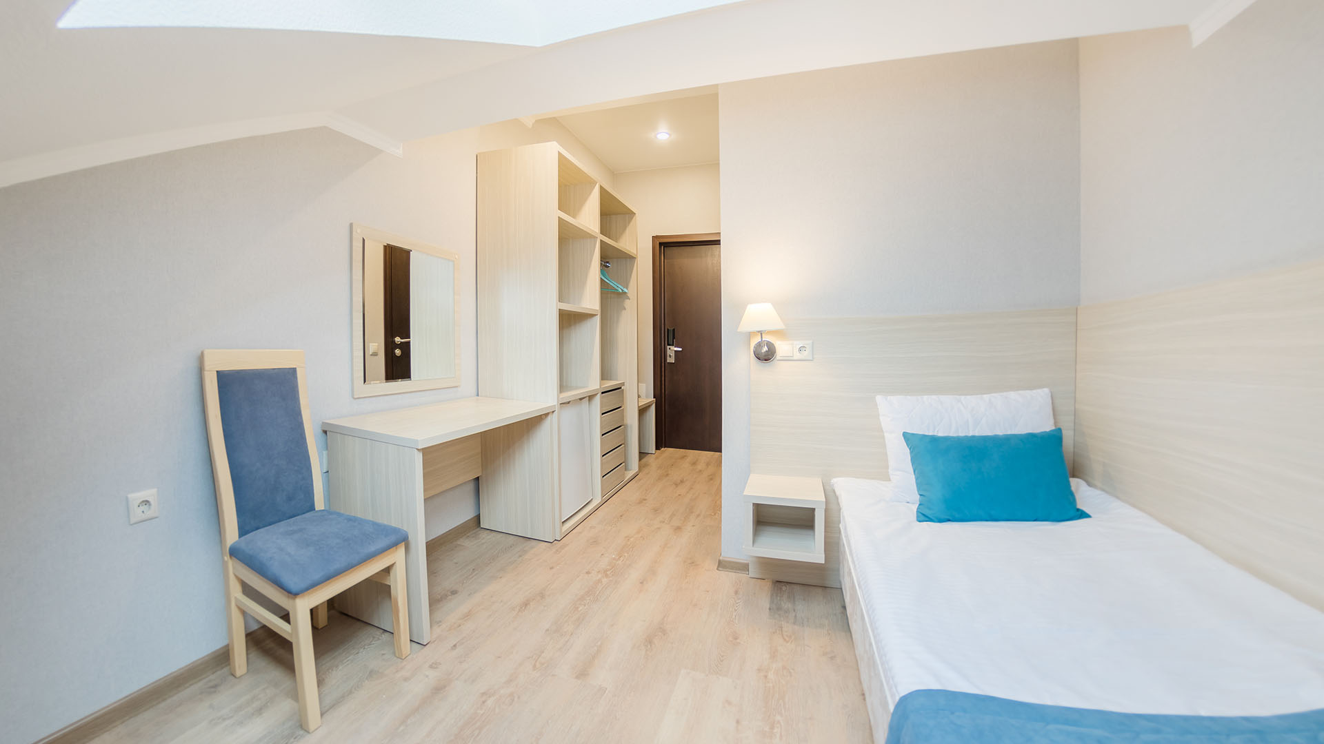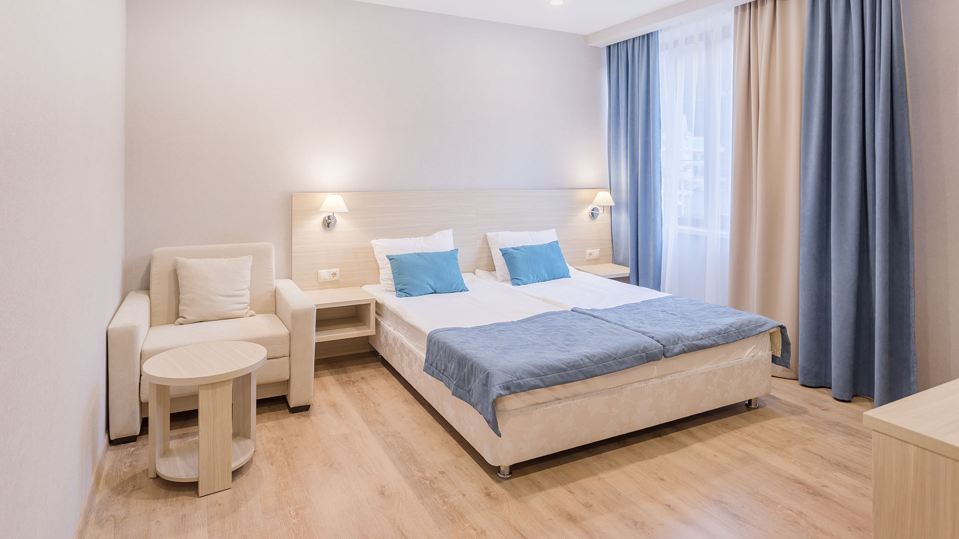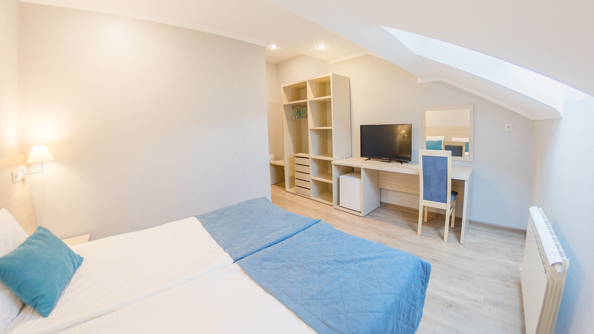 зеркало, кровати односпальные /одна двуспальная кровать, прикроватные тумбочки, стол, стул, шкаф