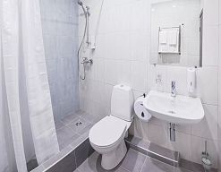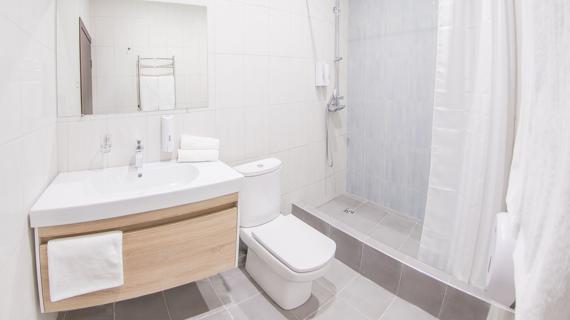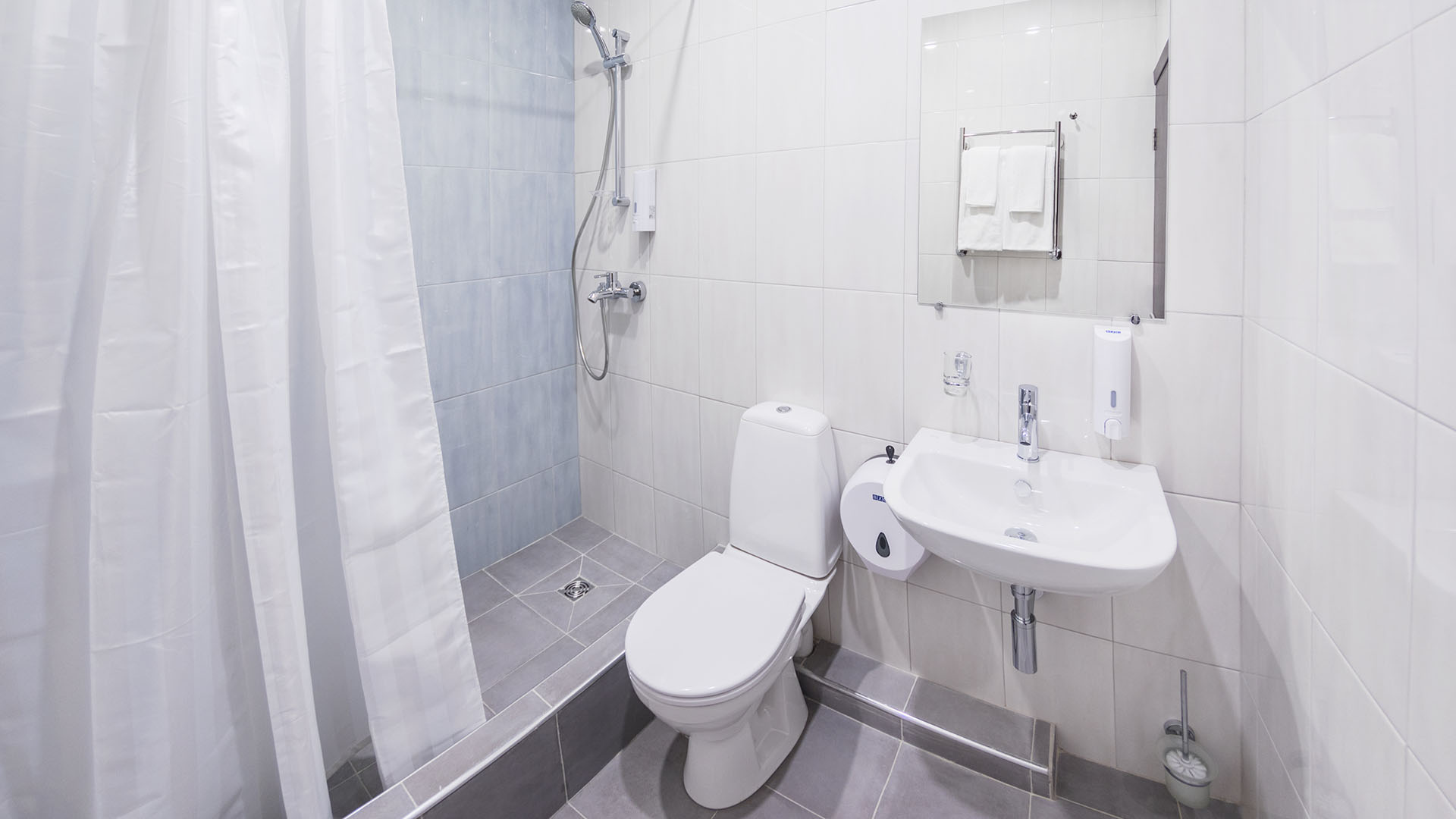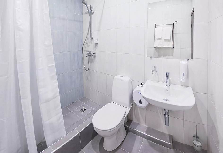 с душем, тапочки, туалетные принадлежности, фен