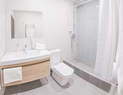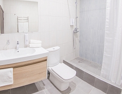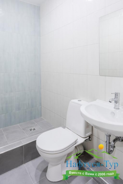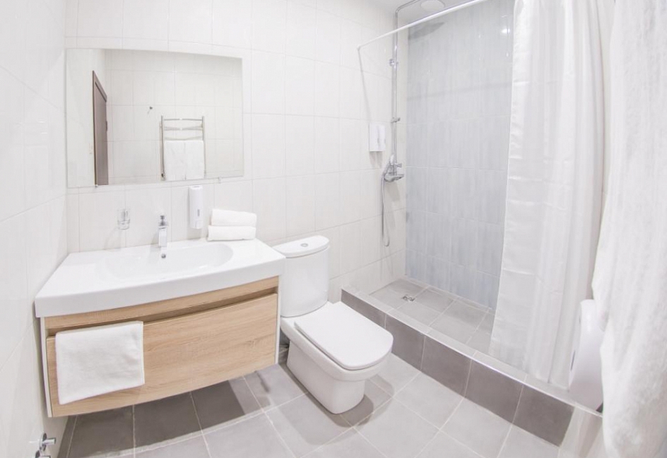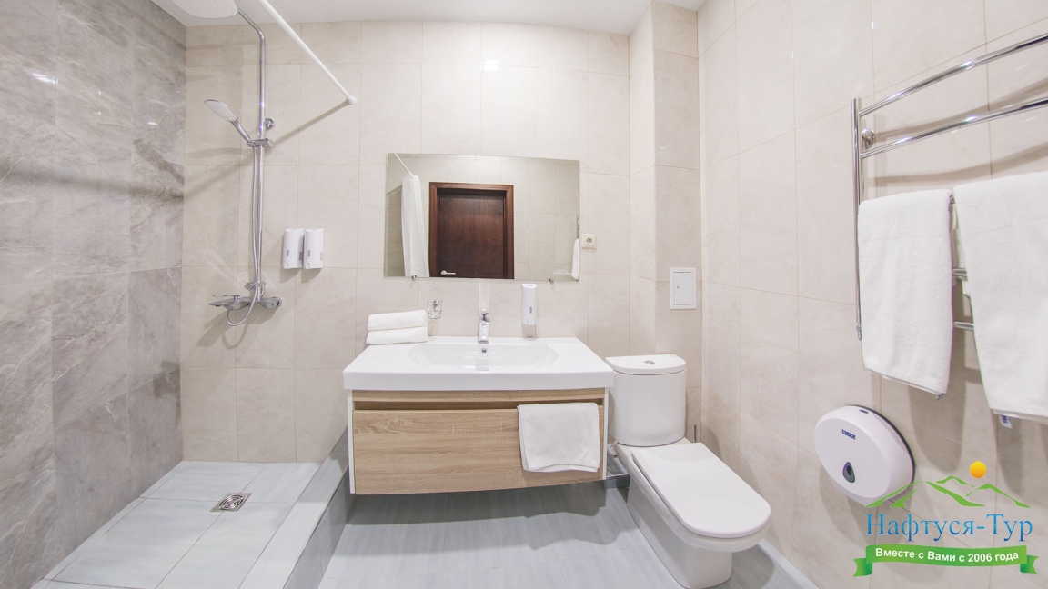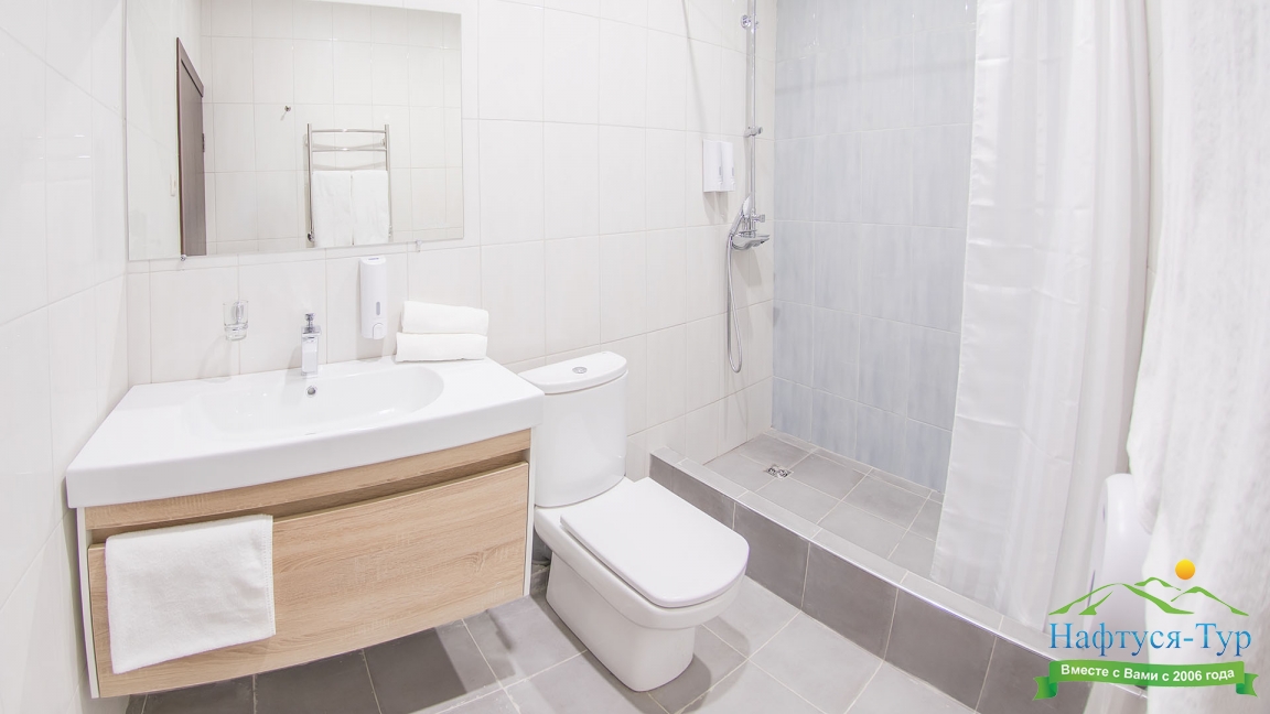 с душем, тапочки, туалетные принадлежности, фен, халат