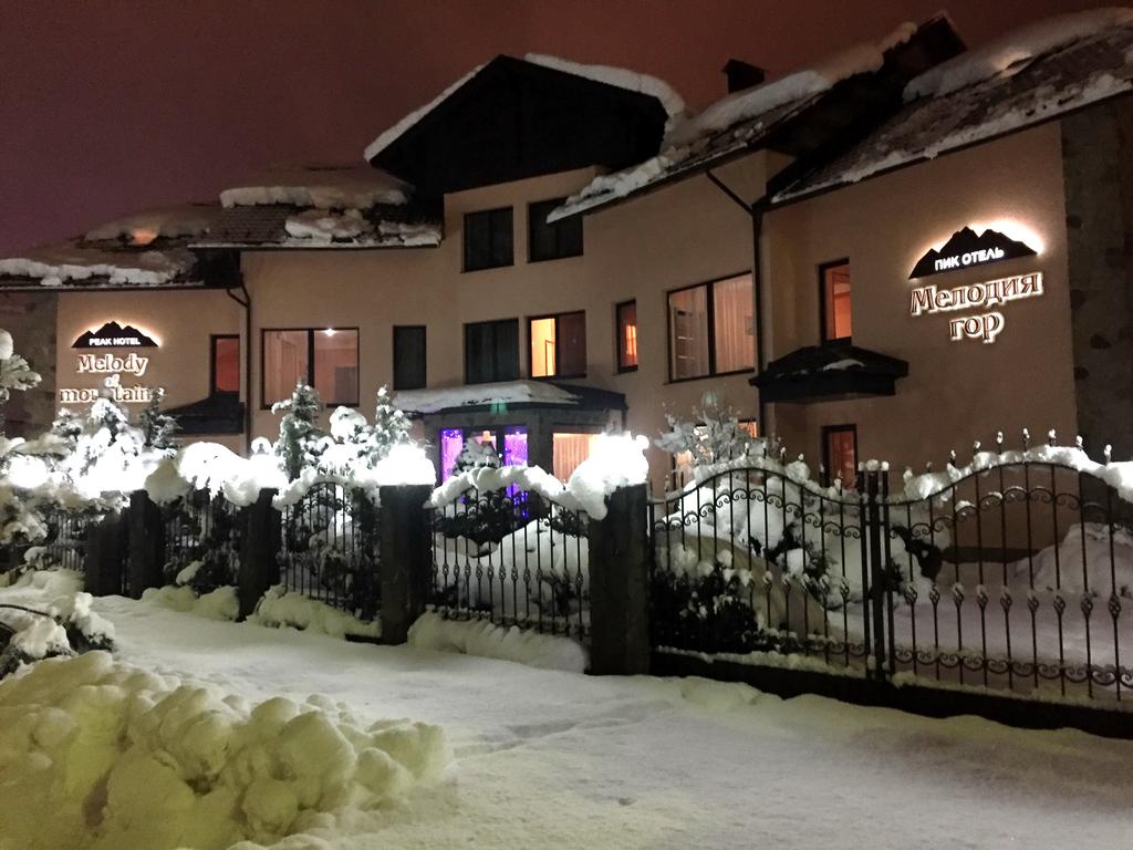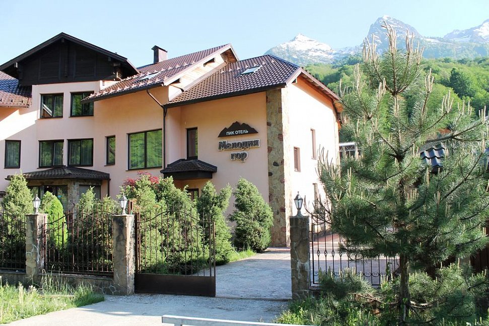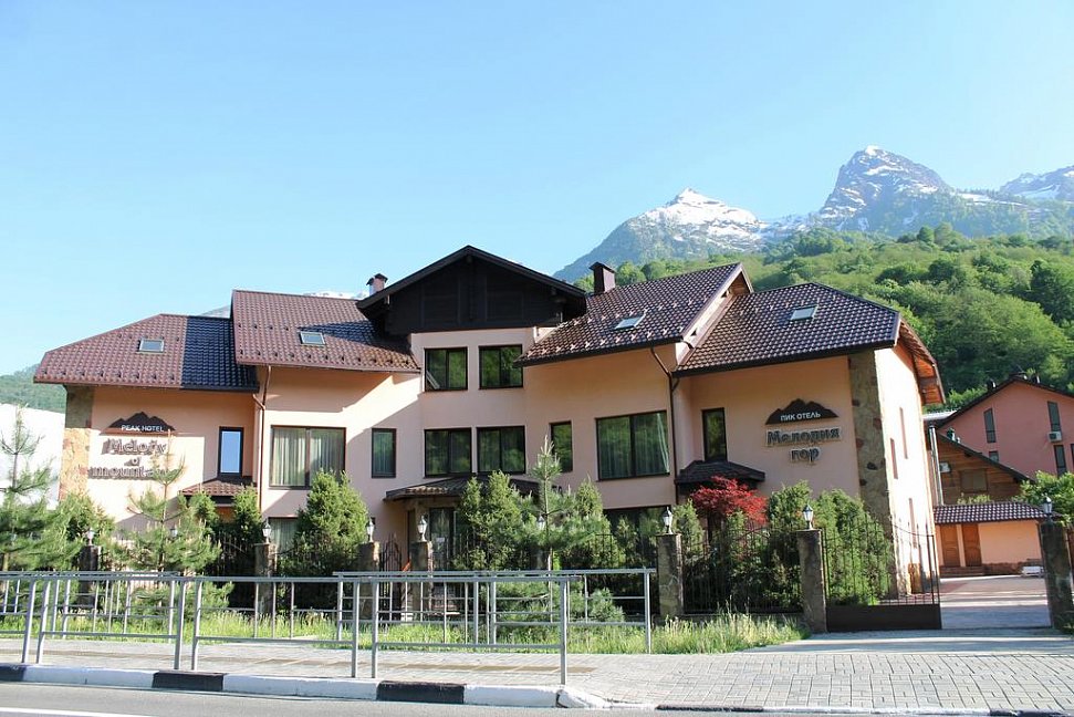 решат пользоваться спусками других горно-туристических центров, то это не вызовет никаких затруднений. Например, расстояние до подъемника ГТЦ Роза-Хутор составляет 1000 метров, а до Горной Карусели – 1500 метров. Пик-отель «Мелодия гор» расположен на нижнем ярусе курортов Эсто Садка, на высоте над уровнем моря более 500 метров. Гостиница предлагает на выбор 18 номеров нескольких категорий комфортности, также имеется отдельный коттедж, вместимостью до 5 человек включительно. В список инфраструктуры «Мелодии гор» входят открытый бассейн с подогревом воды, русская баня, сушилка спортивного инвентаря.