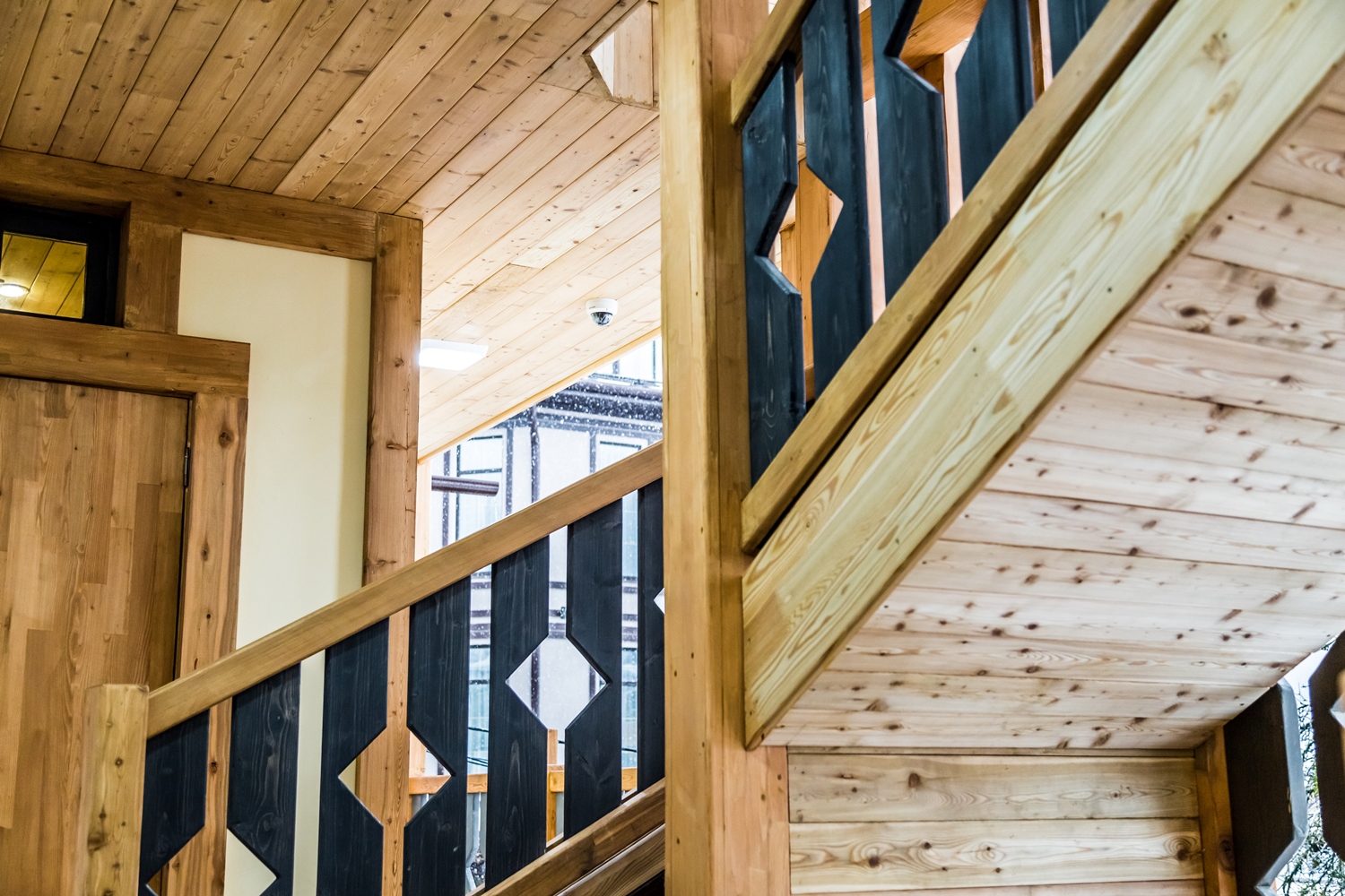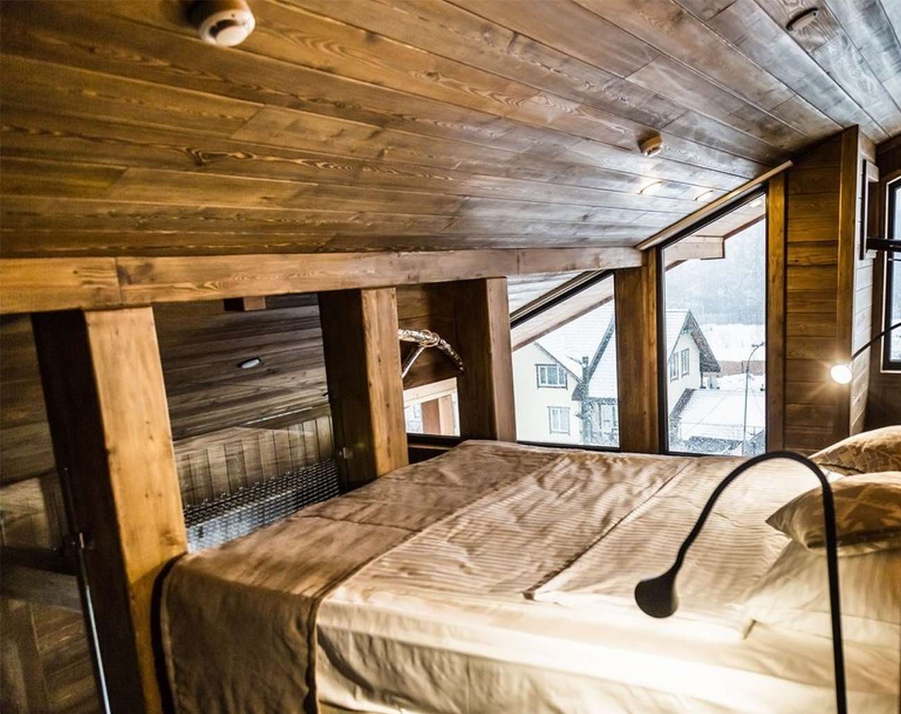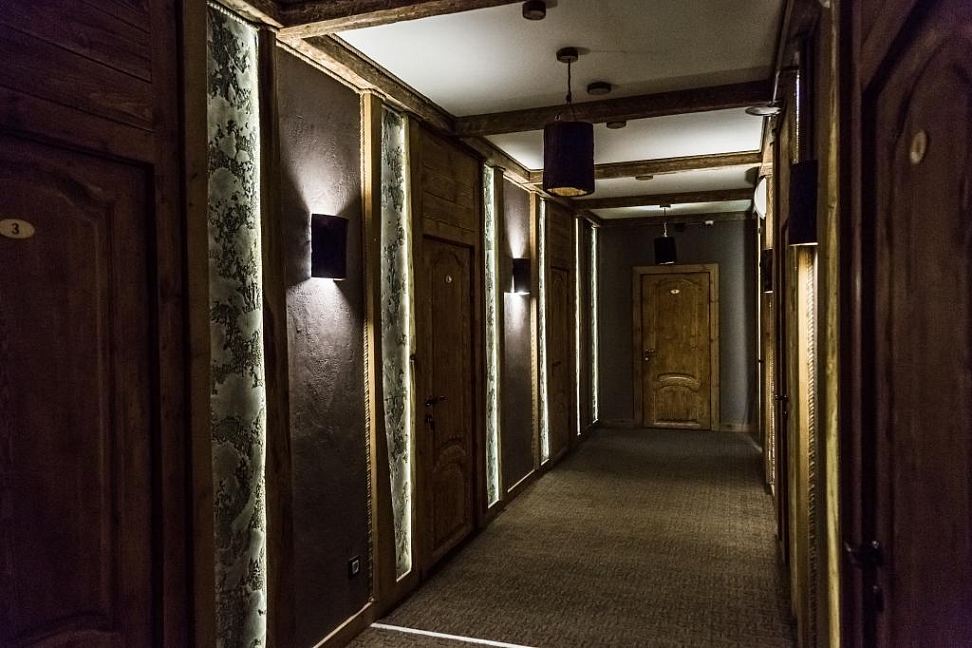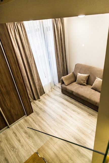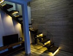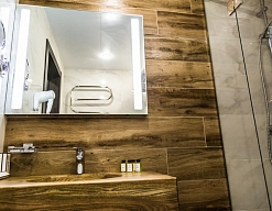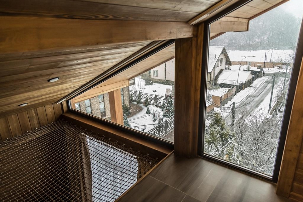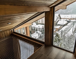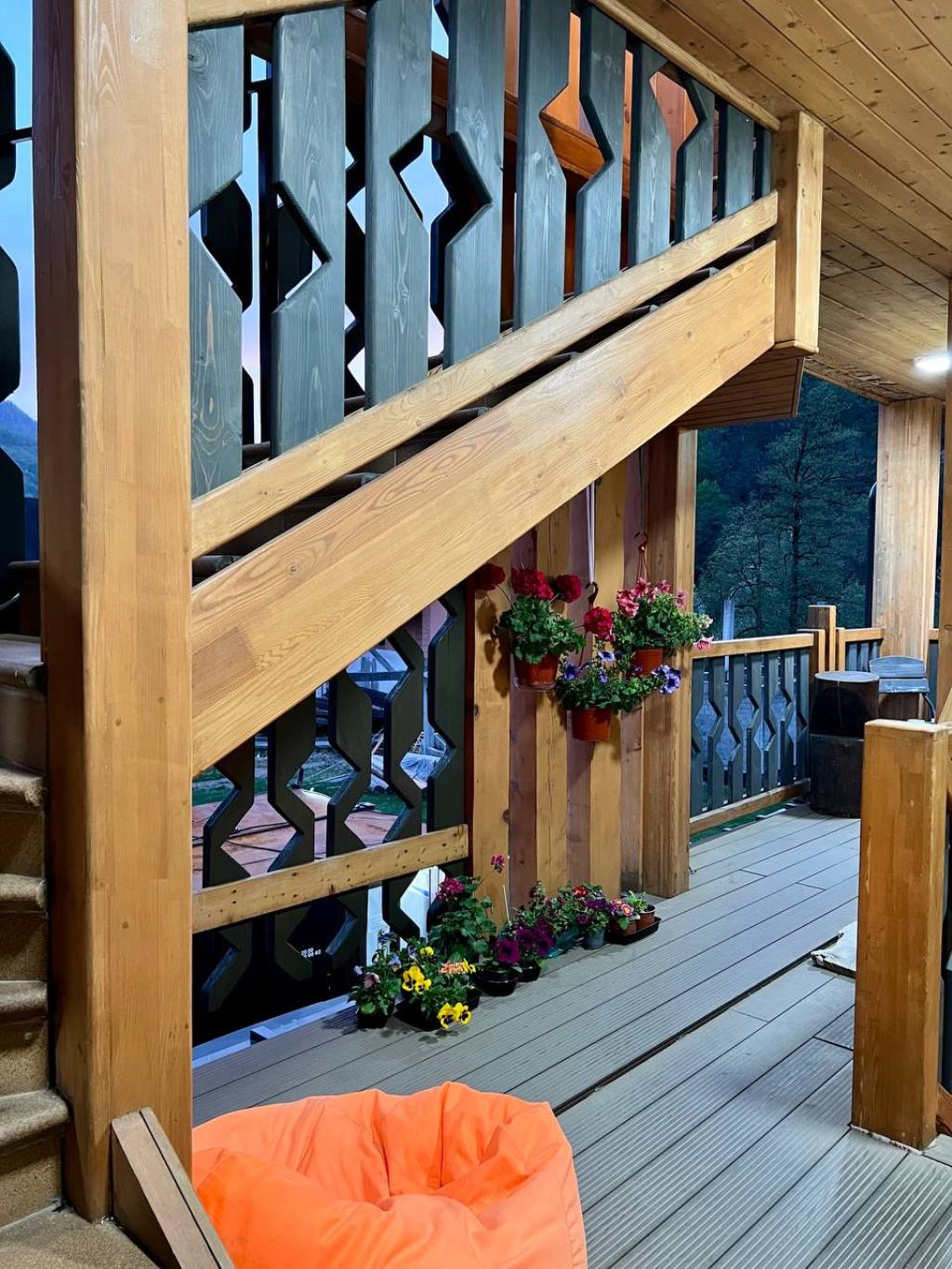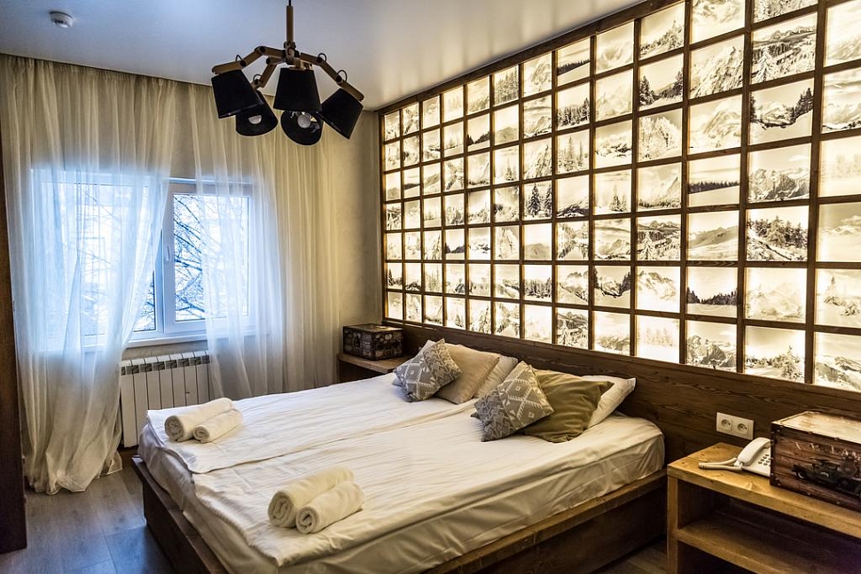 · Отличный номер ! Запах натурального дерева, чисто, отделка дикого камня, Лестницы и Шторы с подсветкой, перегородки из каленого стекла, даже перегородки лестниц, совместили шале и современный стиль.