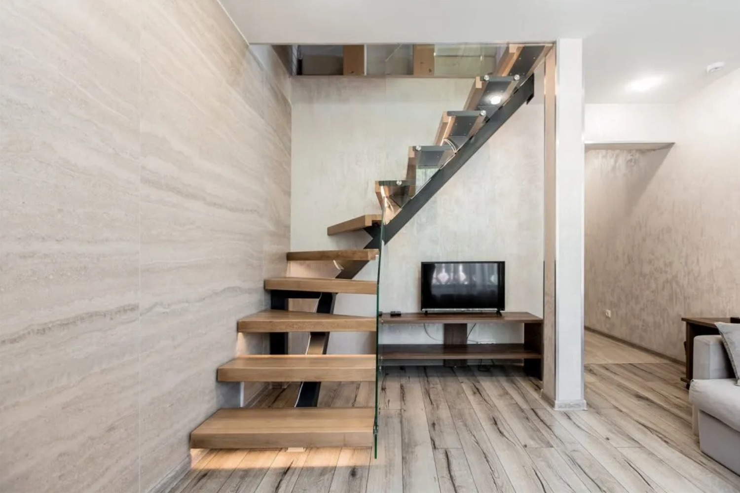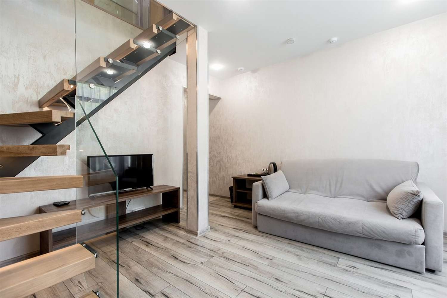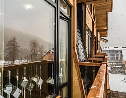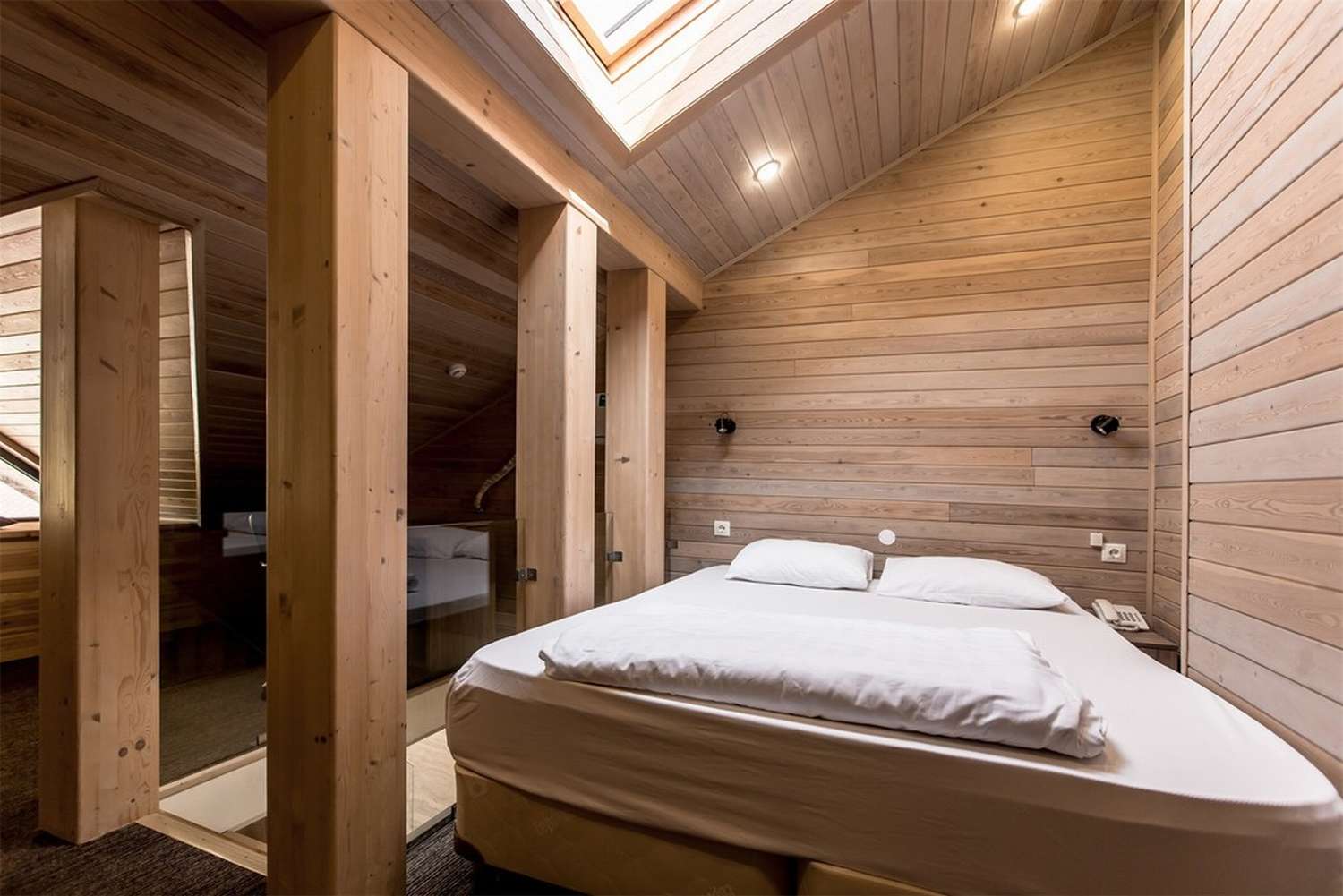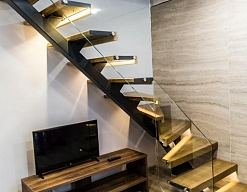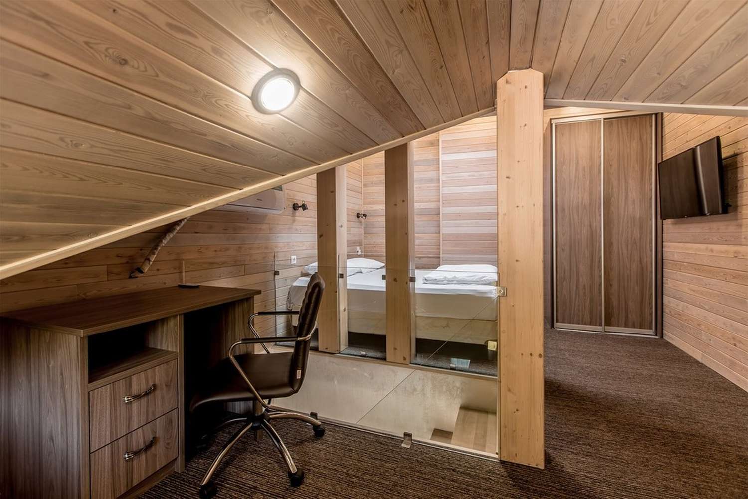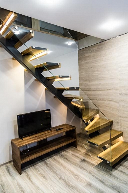 · Отличный номер ! Запах натурального дерева, чисто, отделка дикого камня, Лестницы и Шторы с подсветкой, перегородки из каленого стекла, даже перегородки лестниц, совместили шале и современный стиль.