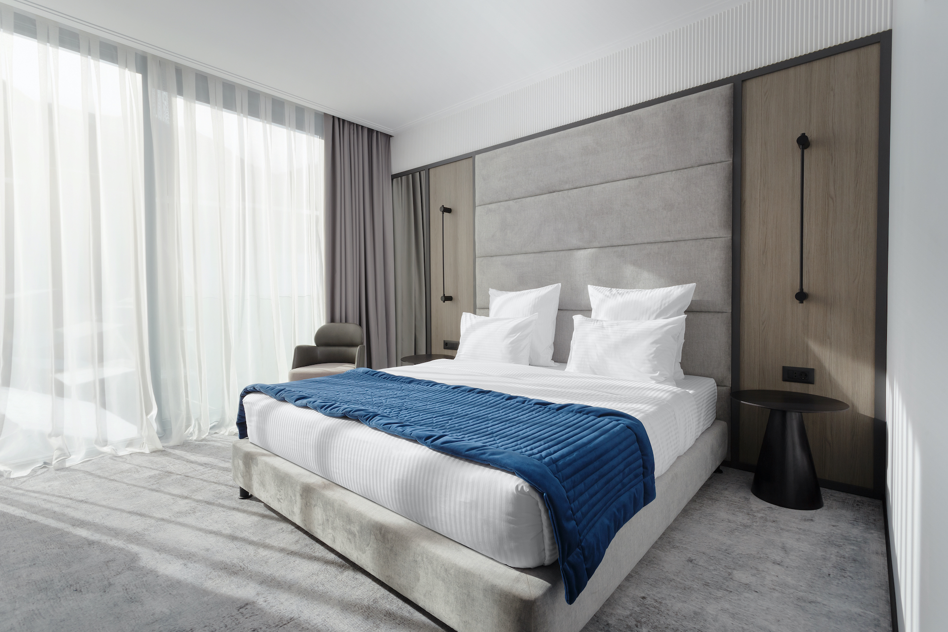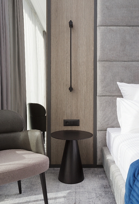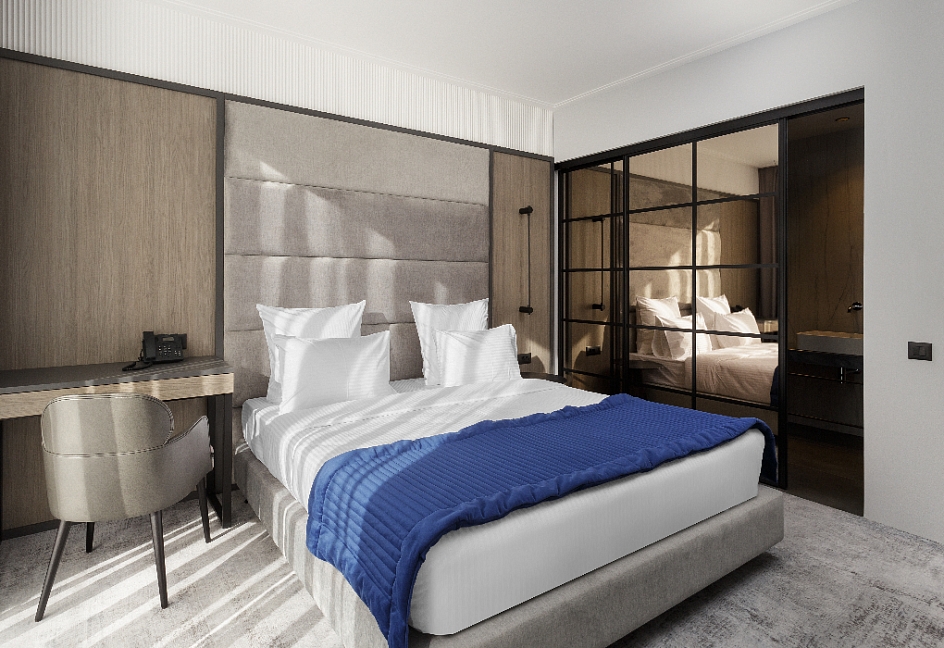 кровать двуспальная, прикроватные столики, стол, стулья, шкаф