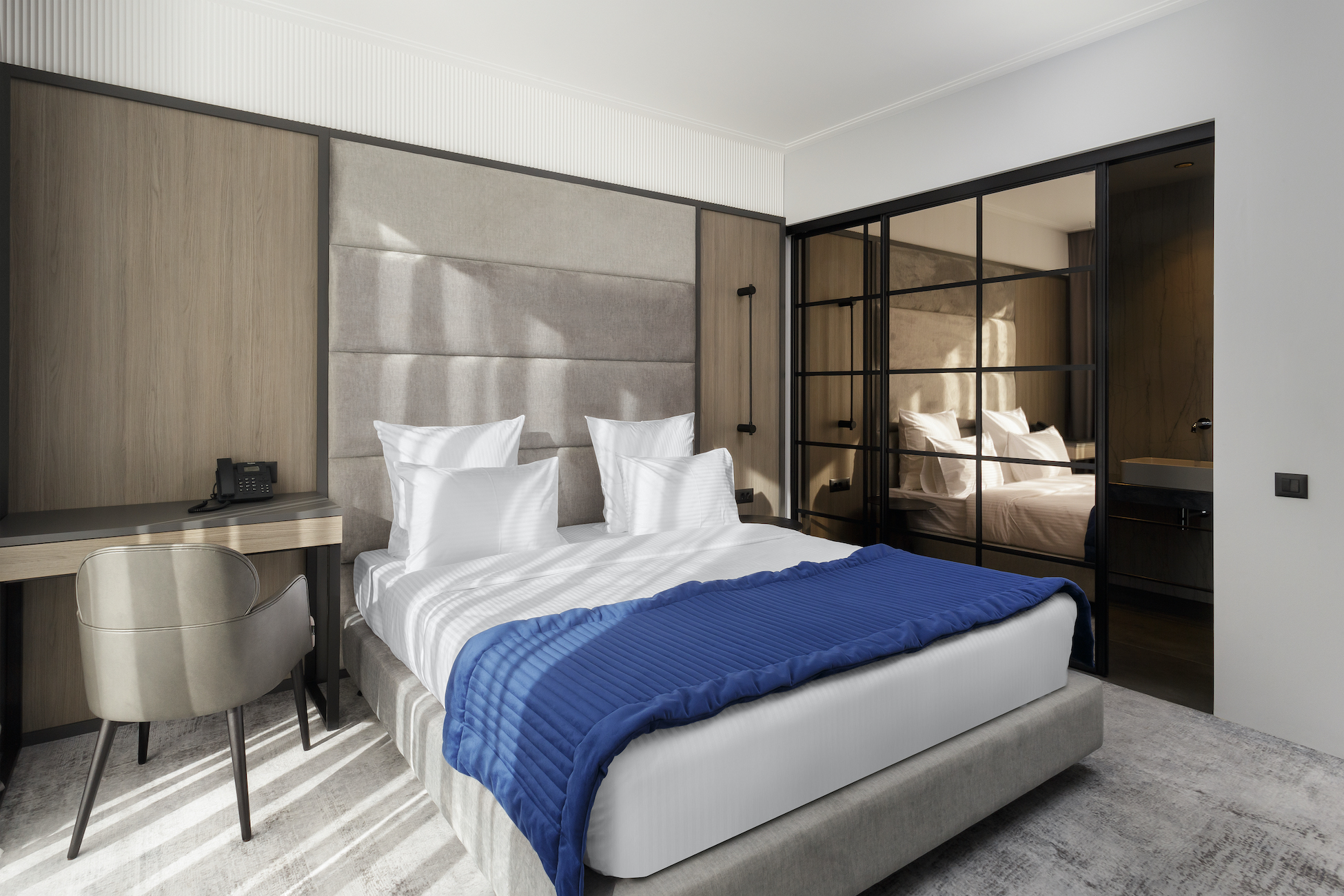 диван, кровать двуспальная, прикроватные столики, стол, стул, шкаф