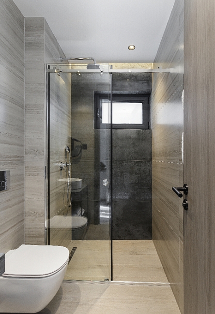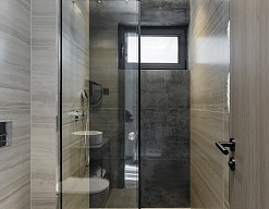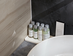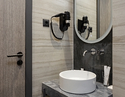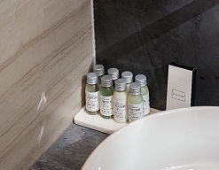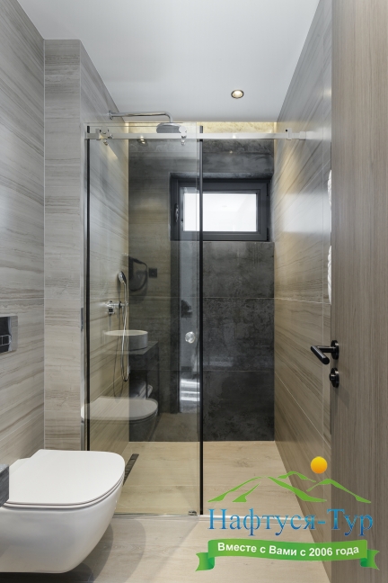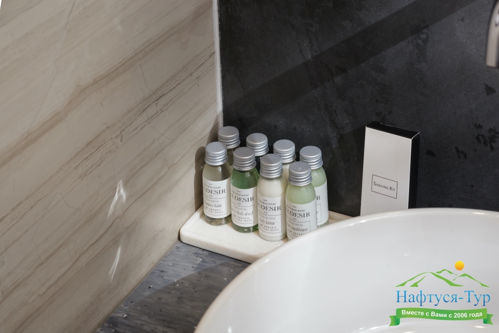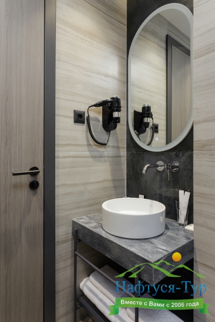 с душем, тапочки, туалетные принадлежности, фен, халат